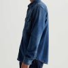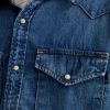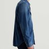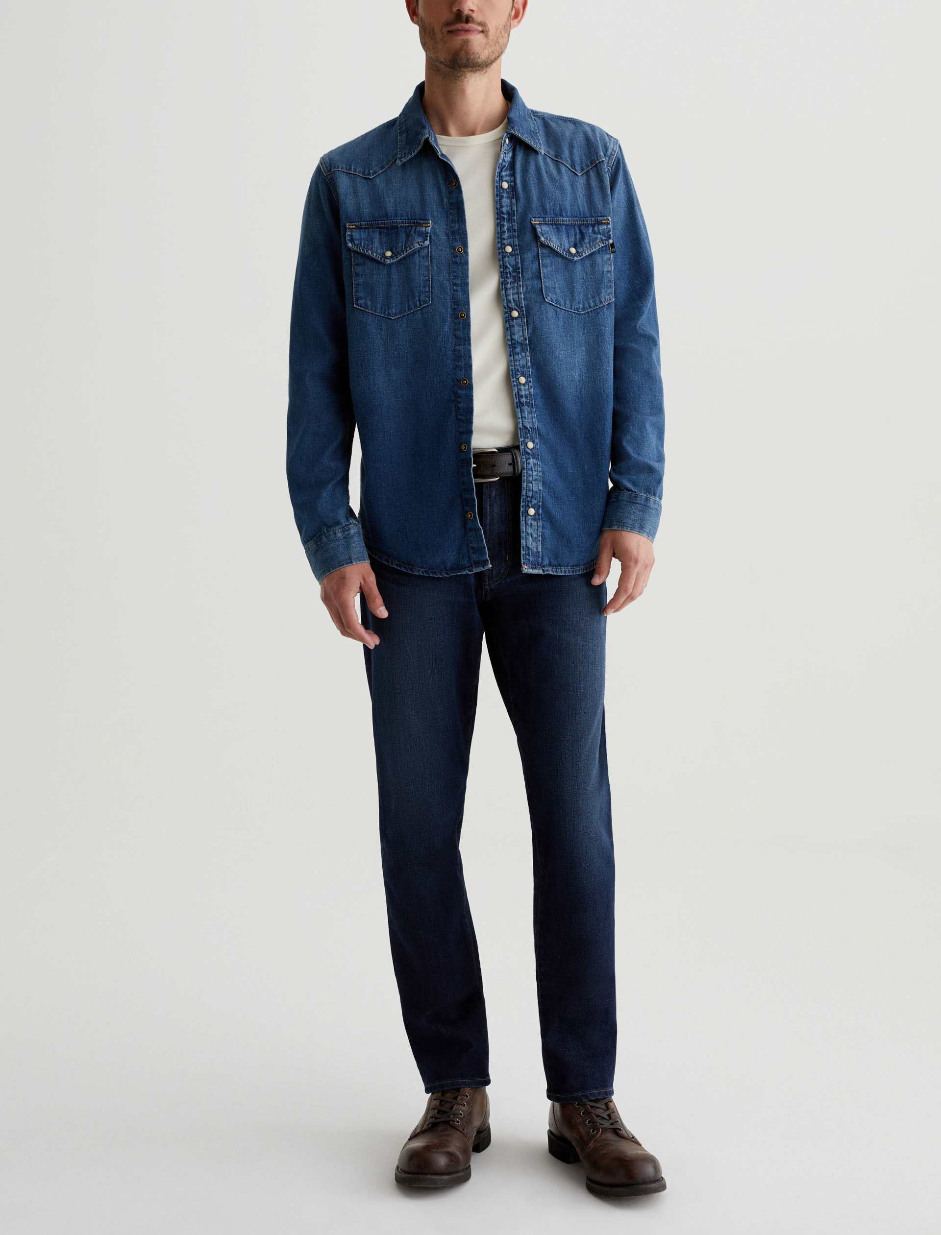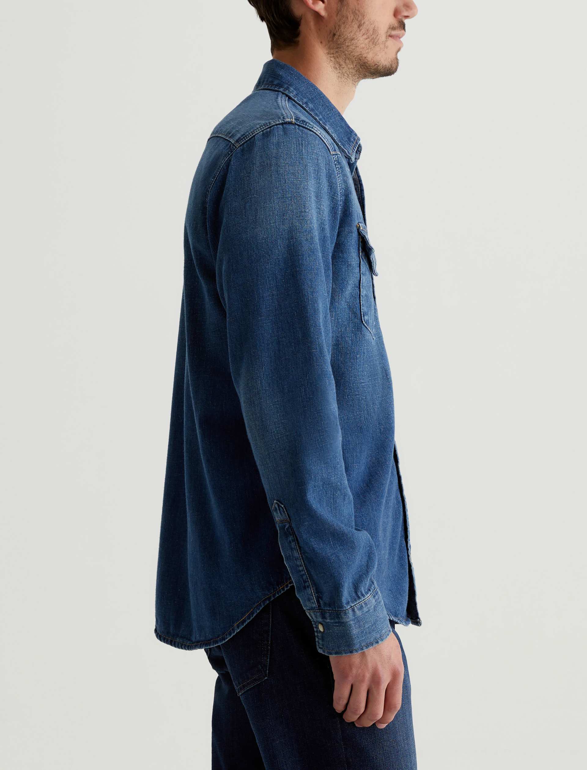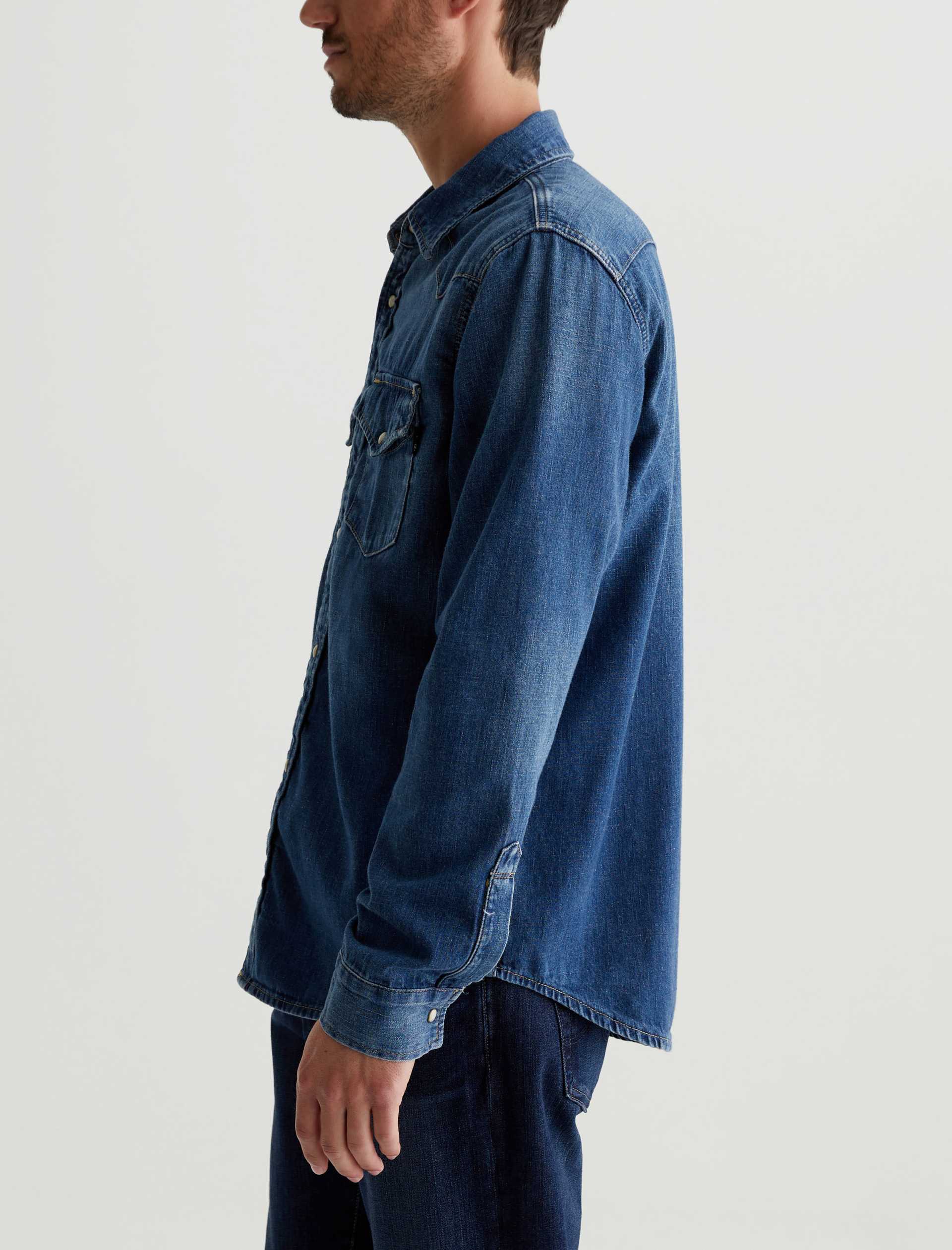 The Aiden Western Shirt for men offers a modern take on vintage Americana style. Made from 100% cotton in a faded indigo wash, this classic denim shirt has angled shoulder panels, flap pockets at the chest, and snap buttons throughout.