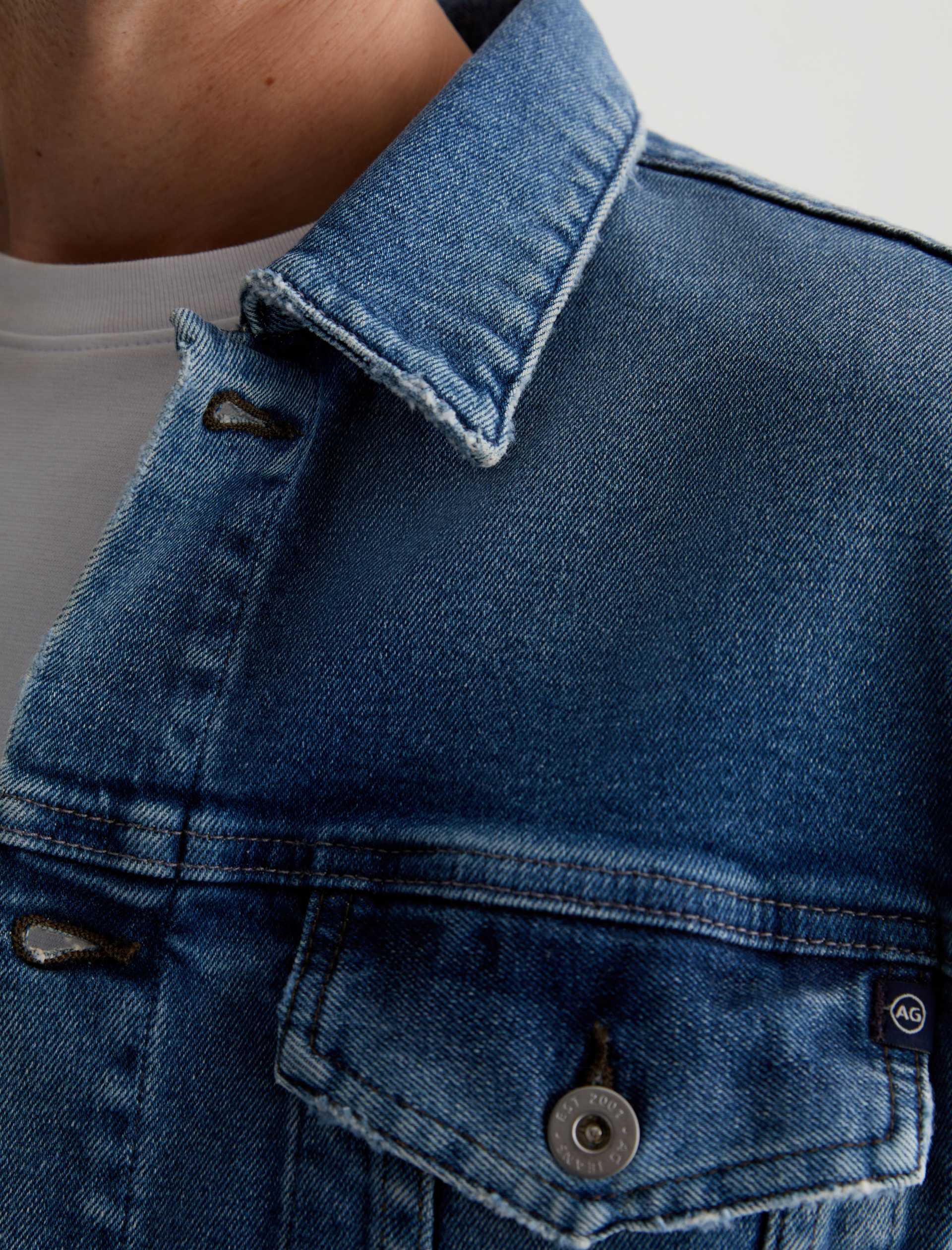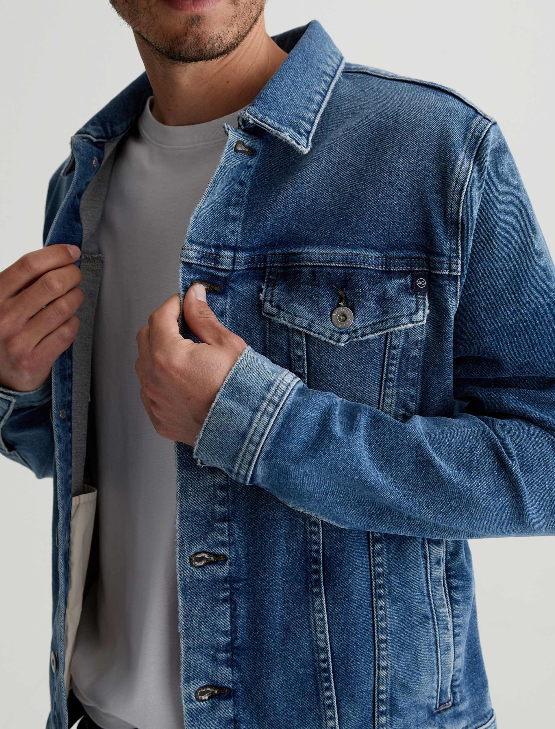 The Dart Jacket is a classic men’s trucker that you can wear in any season. It’s made from 12 oz. Classic Comfort Stretch Denim in a faded blue wash. Flap pockets at the chest, adjustable waist tabs, and concealed hip pockets are functional details that bring timeless appeal to this essential layering piece.