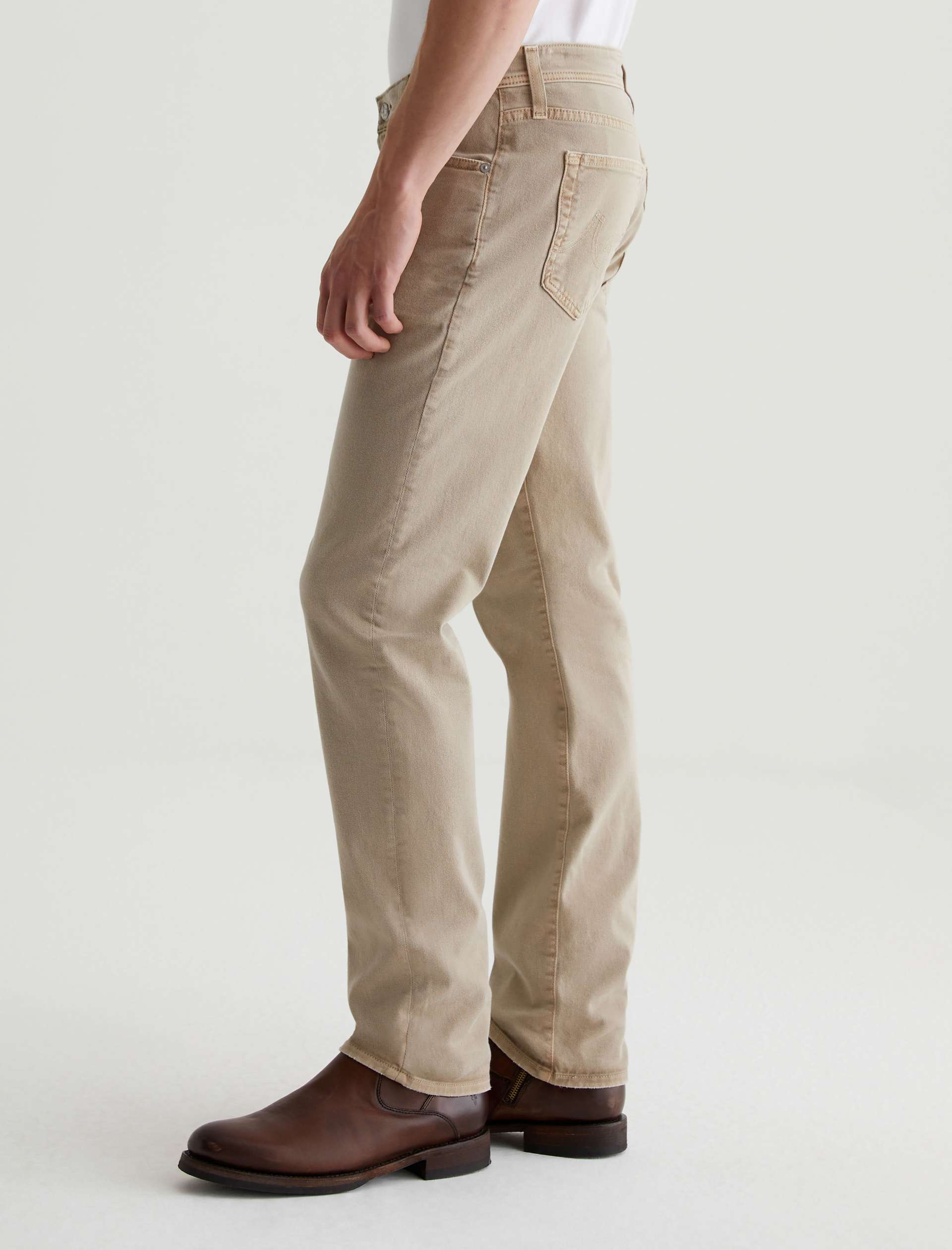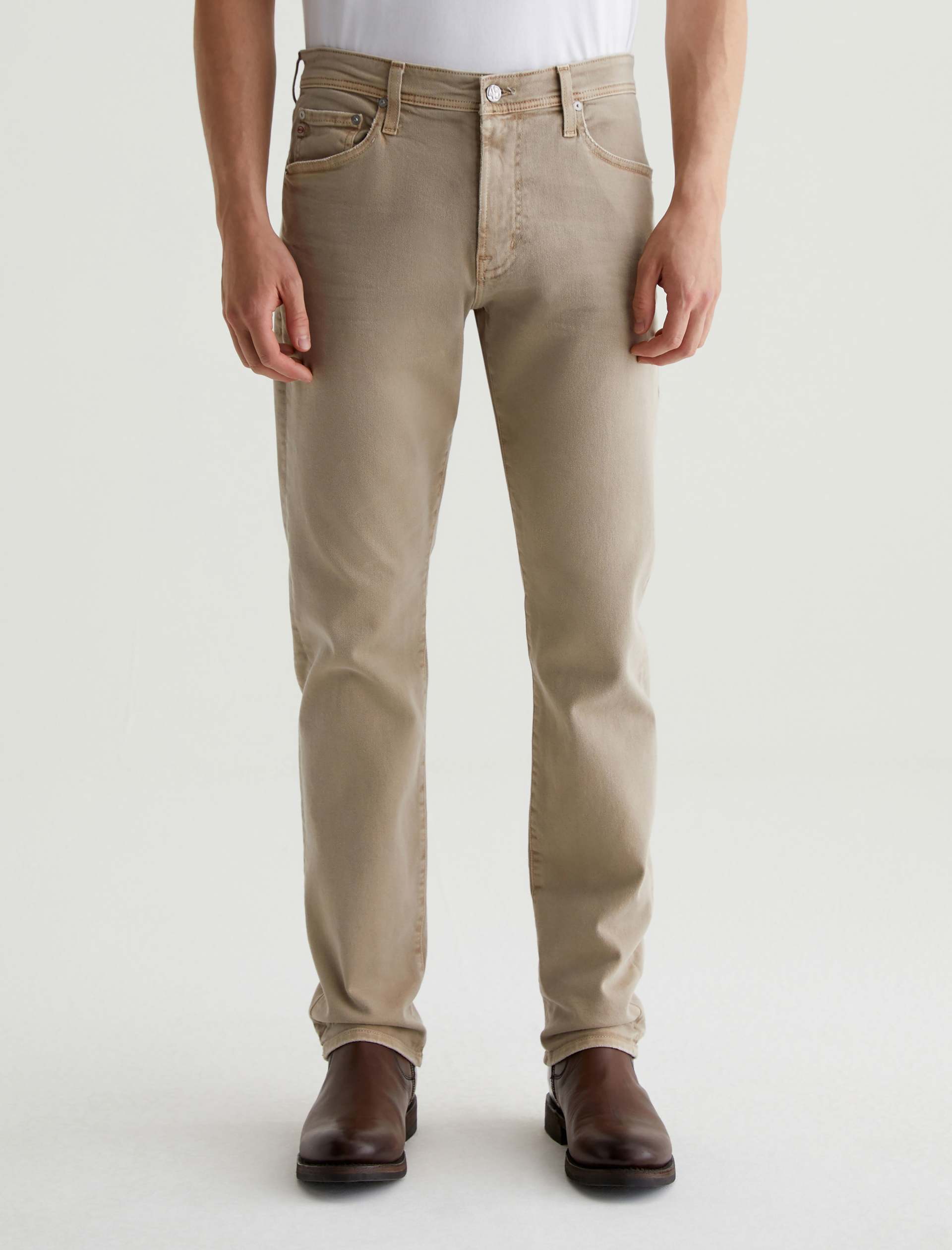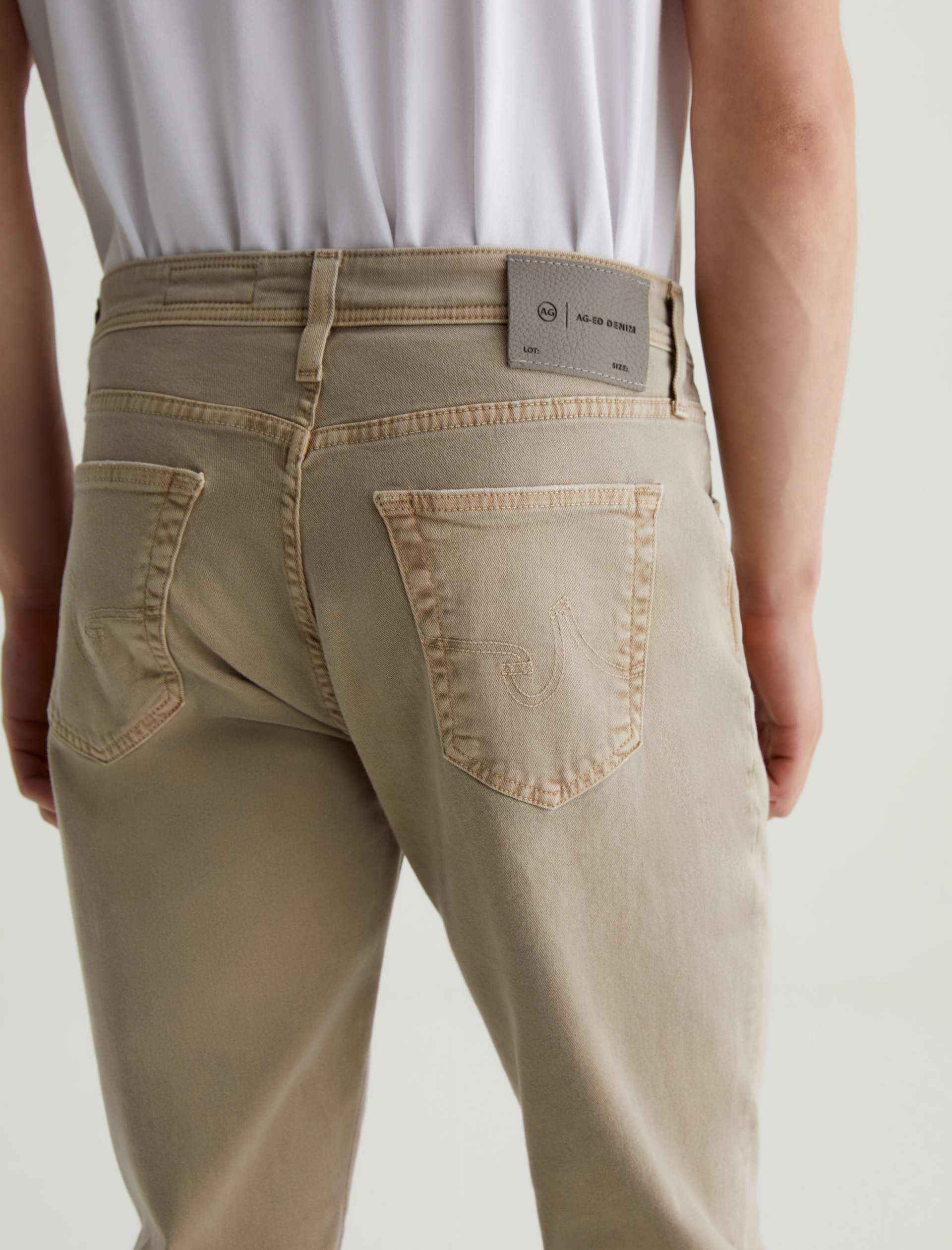 The Everett is a slim-straight men’s jean in a sulfur-dyed khaki shade. AG-ed™ fading and worn pocket edges lend an authentic lived-in look. The style has a mid-rise waist and a straight fit that’s relaxed from hip to knee before slightly tapering at the leg opening. These slim-straight men’s jeans feature 8.7 oz. Hype