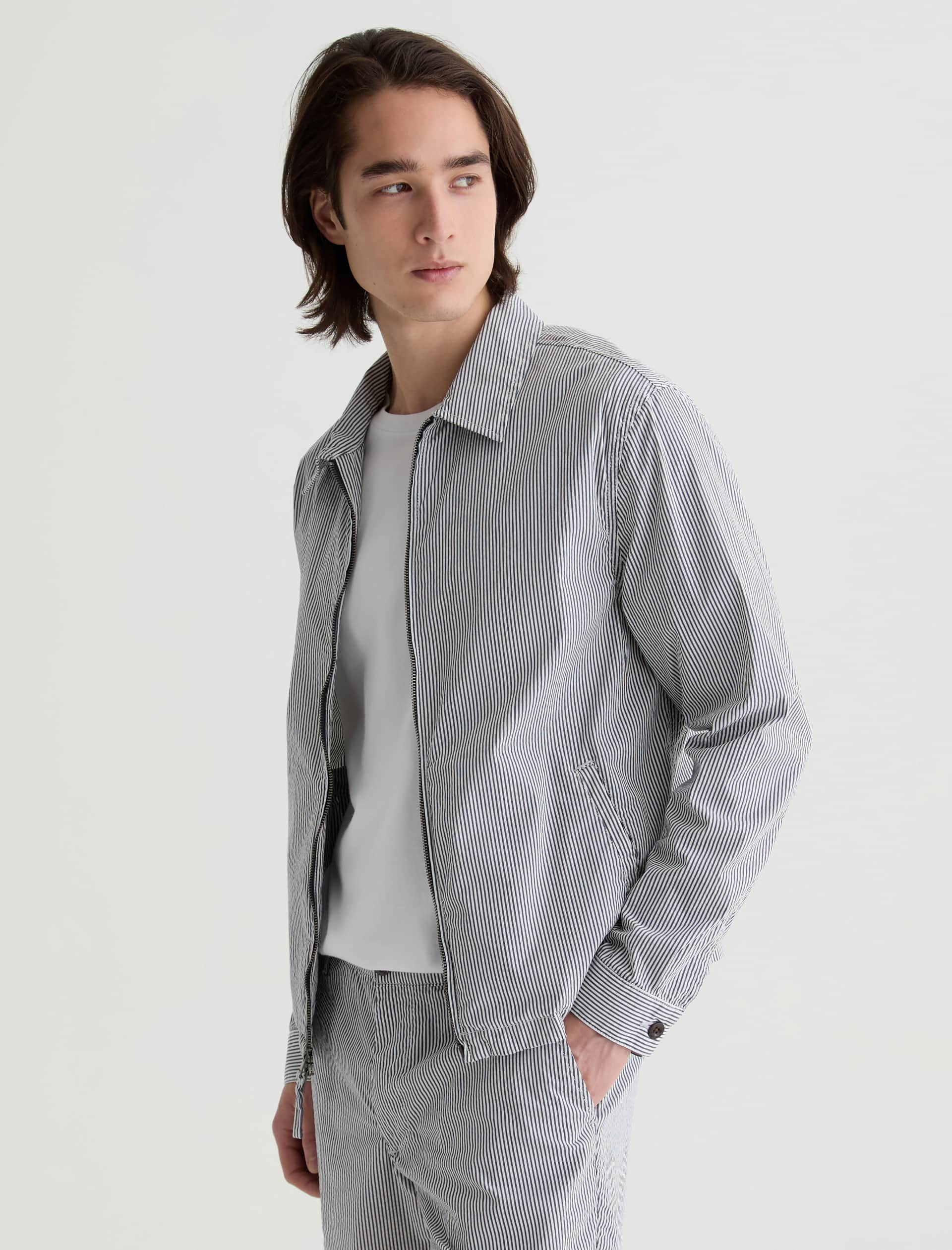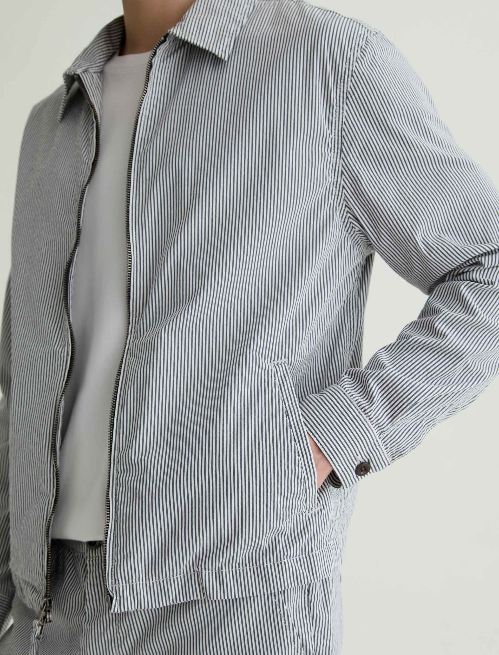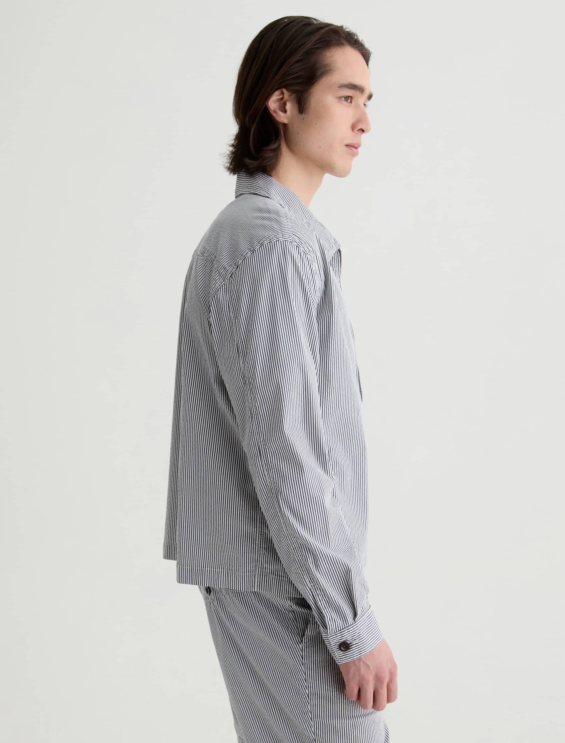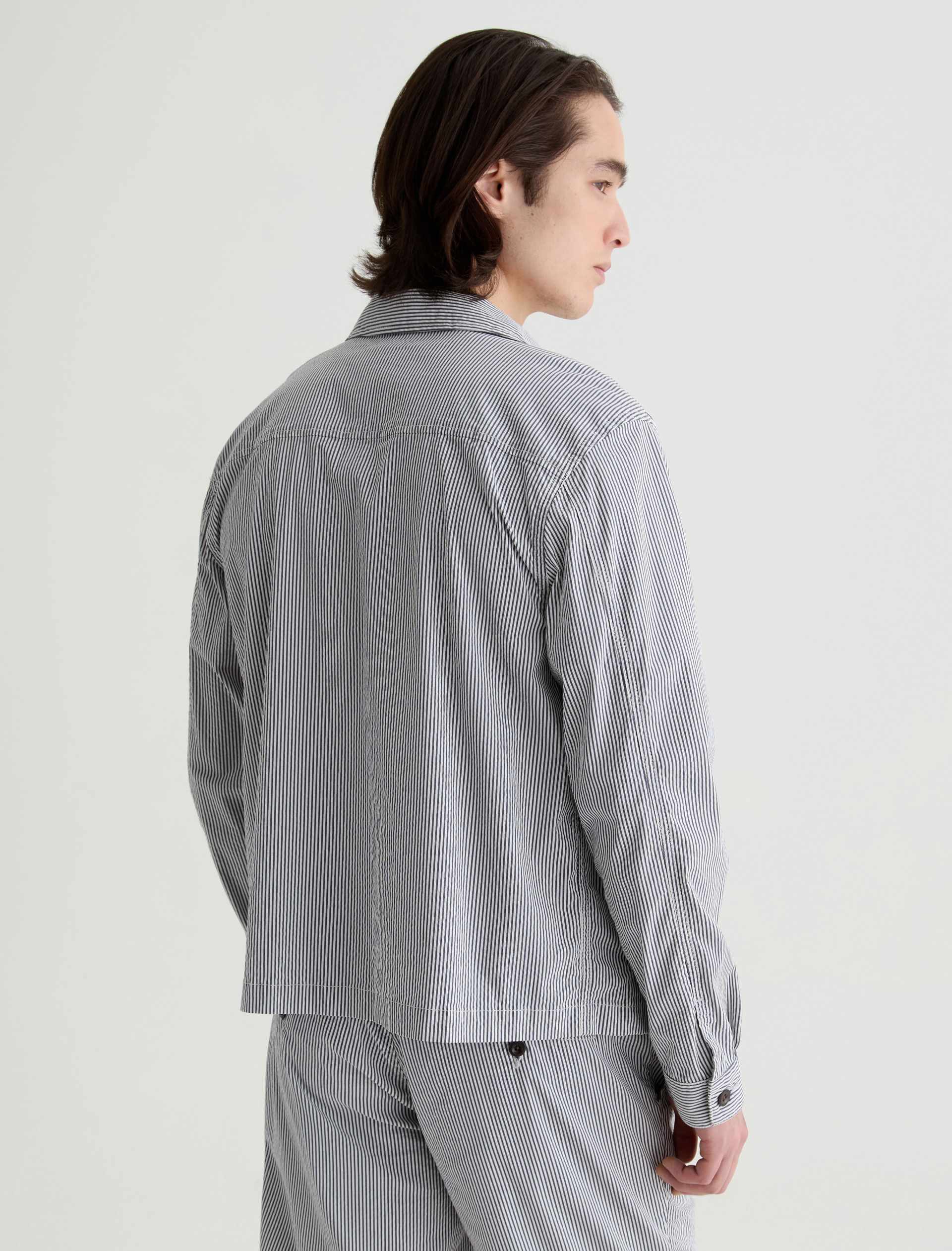 The Philip Zip Jacket is a modern chore coat with long sleeves and a boxy silhouette that tapers slightly at the hem. Designed for a relaxed fit through the chest and shoulders, it features a front zip closure, flap pockets, and a center back seam. Made from Easy Stripe Seersucker, this style comes in a soft grey wash