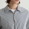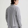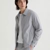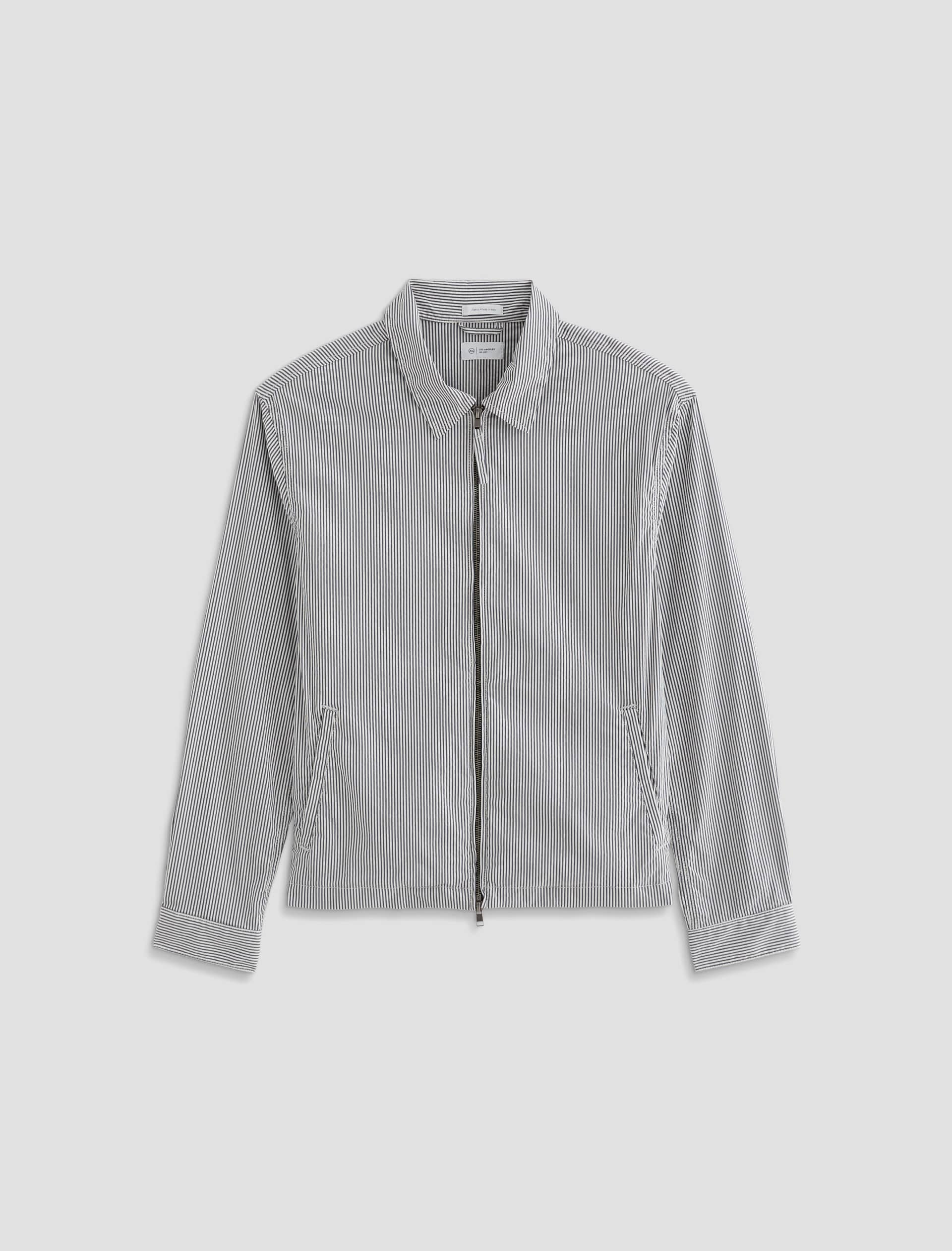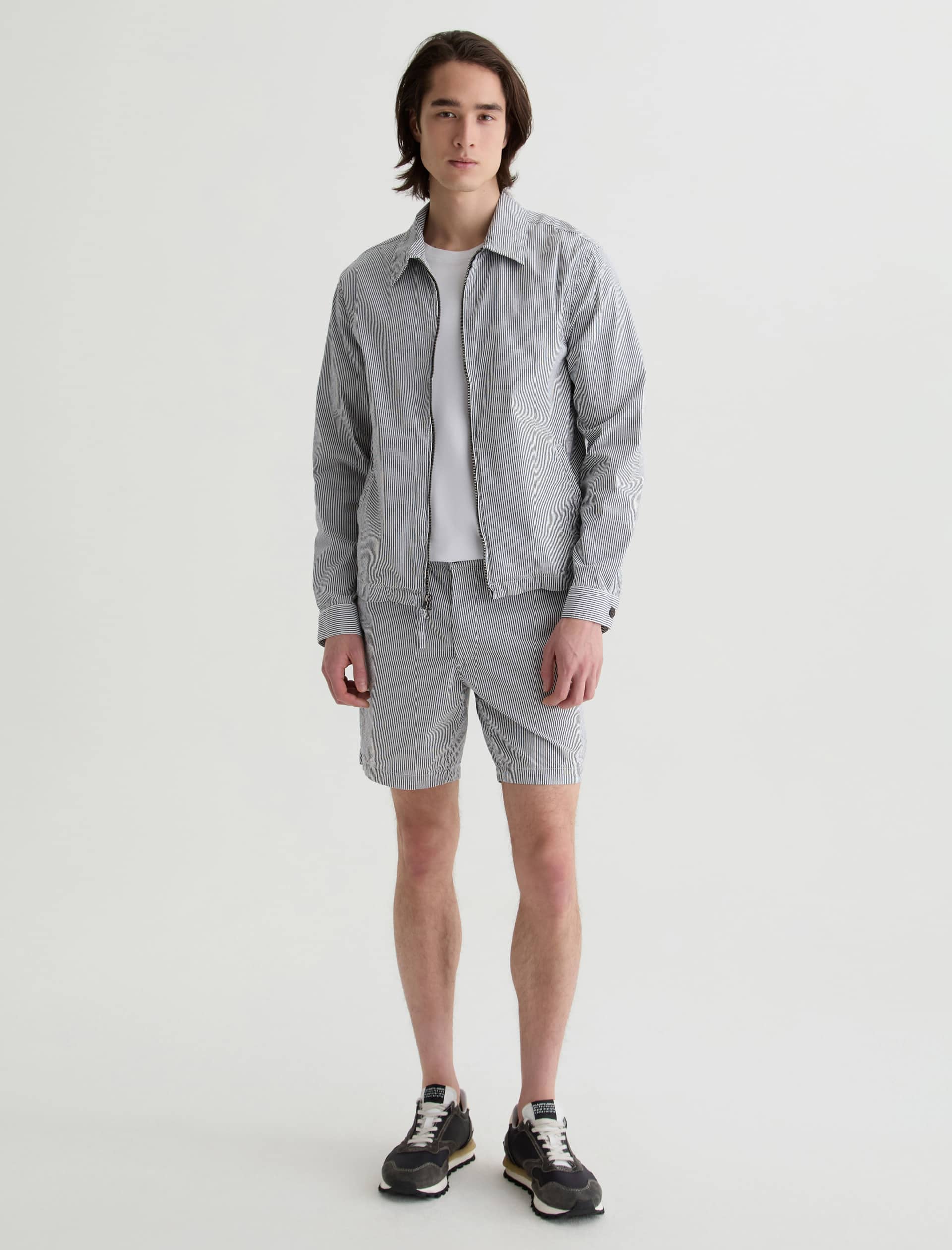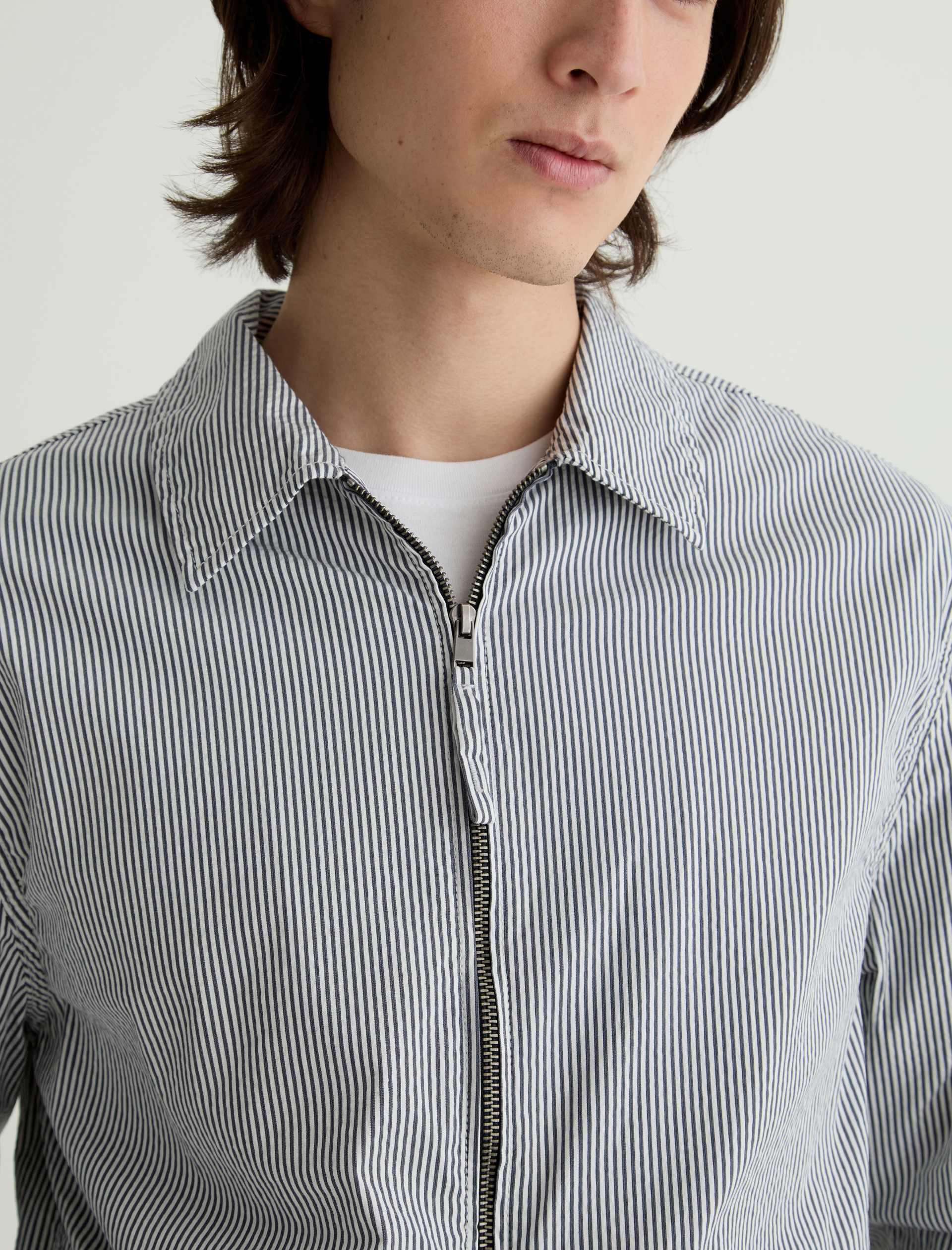 The Philip Zip Jacket is a modern chore coat with long sleeves and a boxy silhouette that tapers slightly at the hem. Designed for a relaxed fit through the chest and shoulders, it features a front zip closure, flap pockets, and a center back seam. Made from Easy Stripe Seersucker, this style comes in a soft grey wash