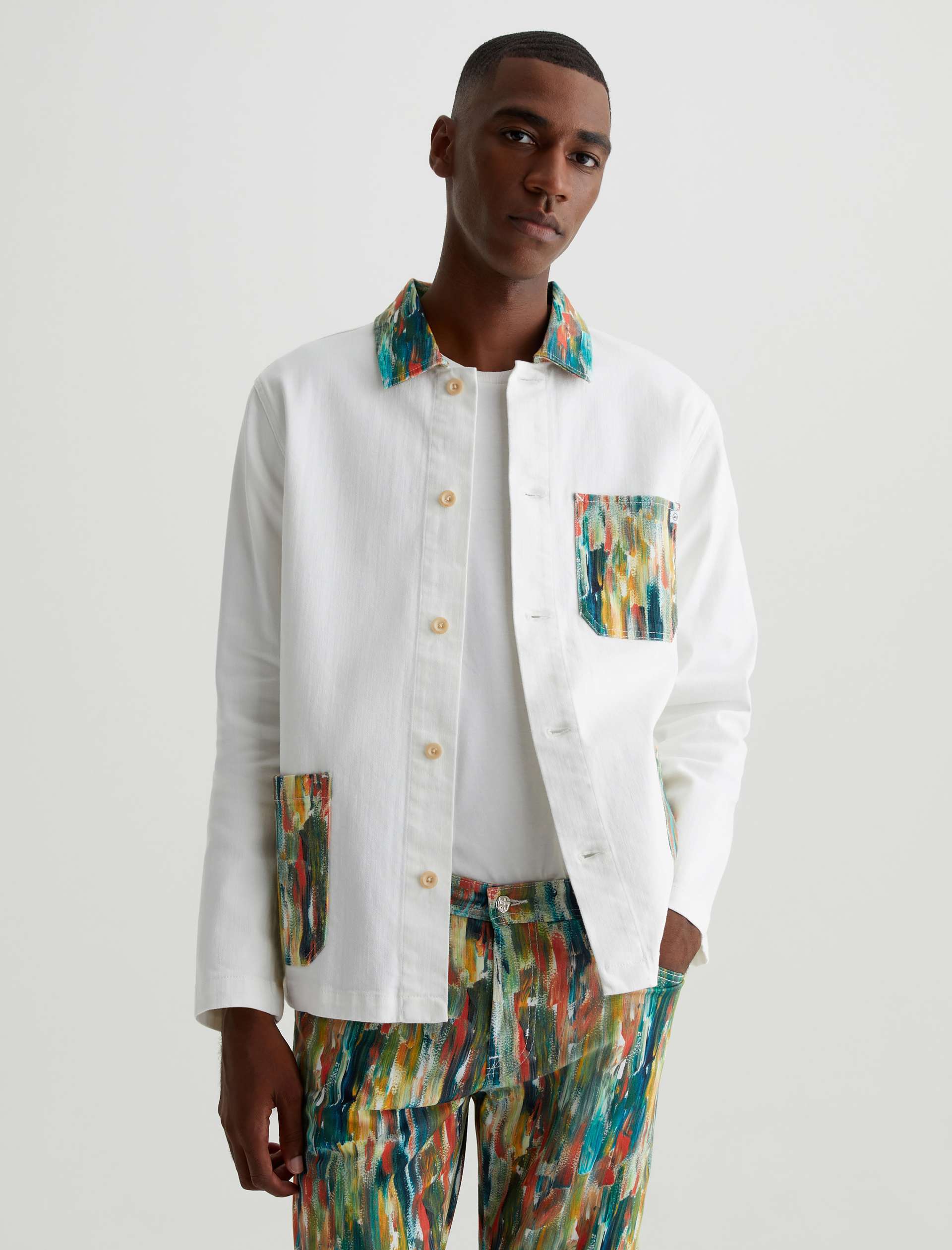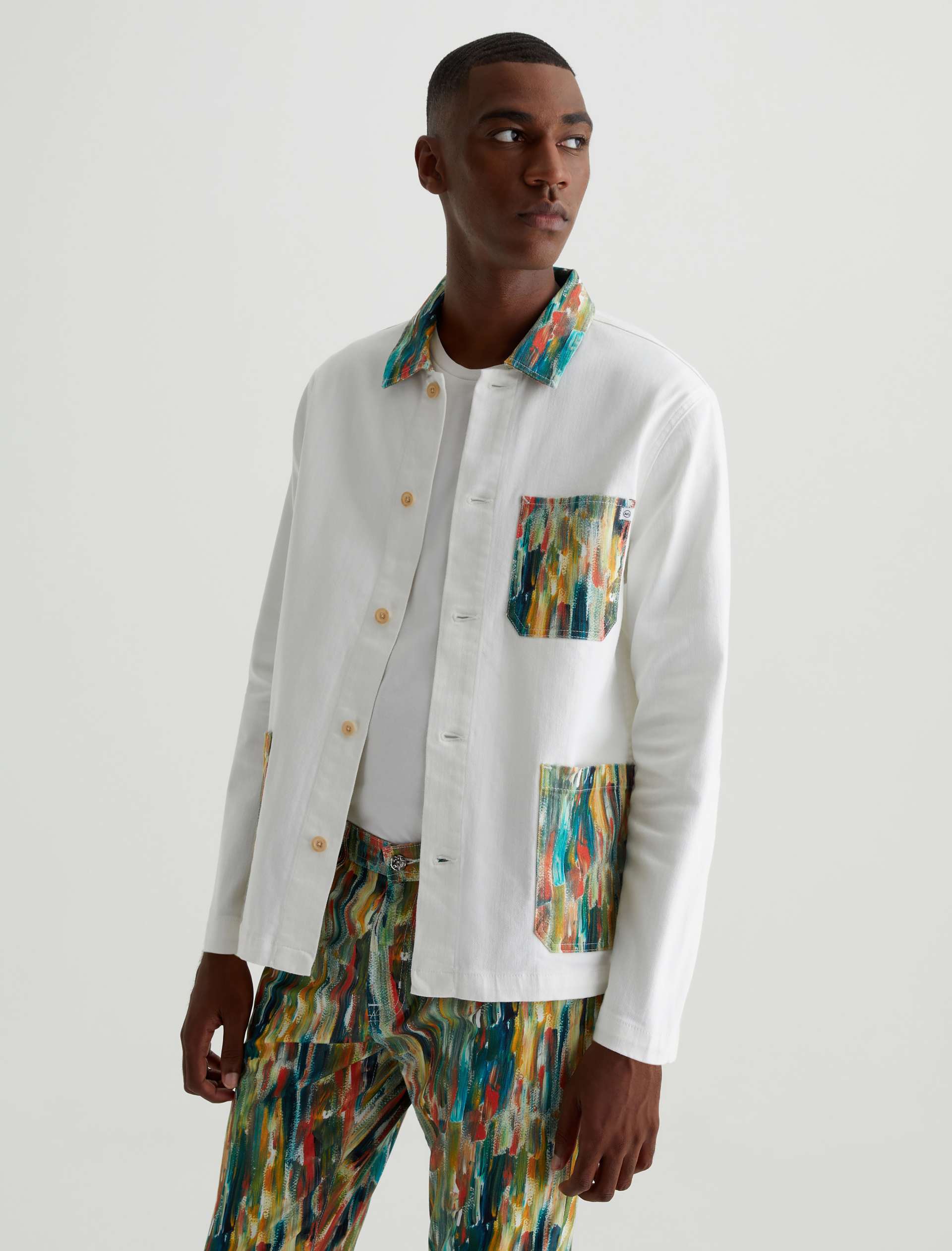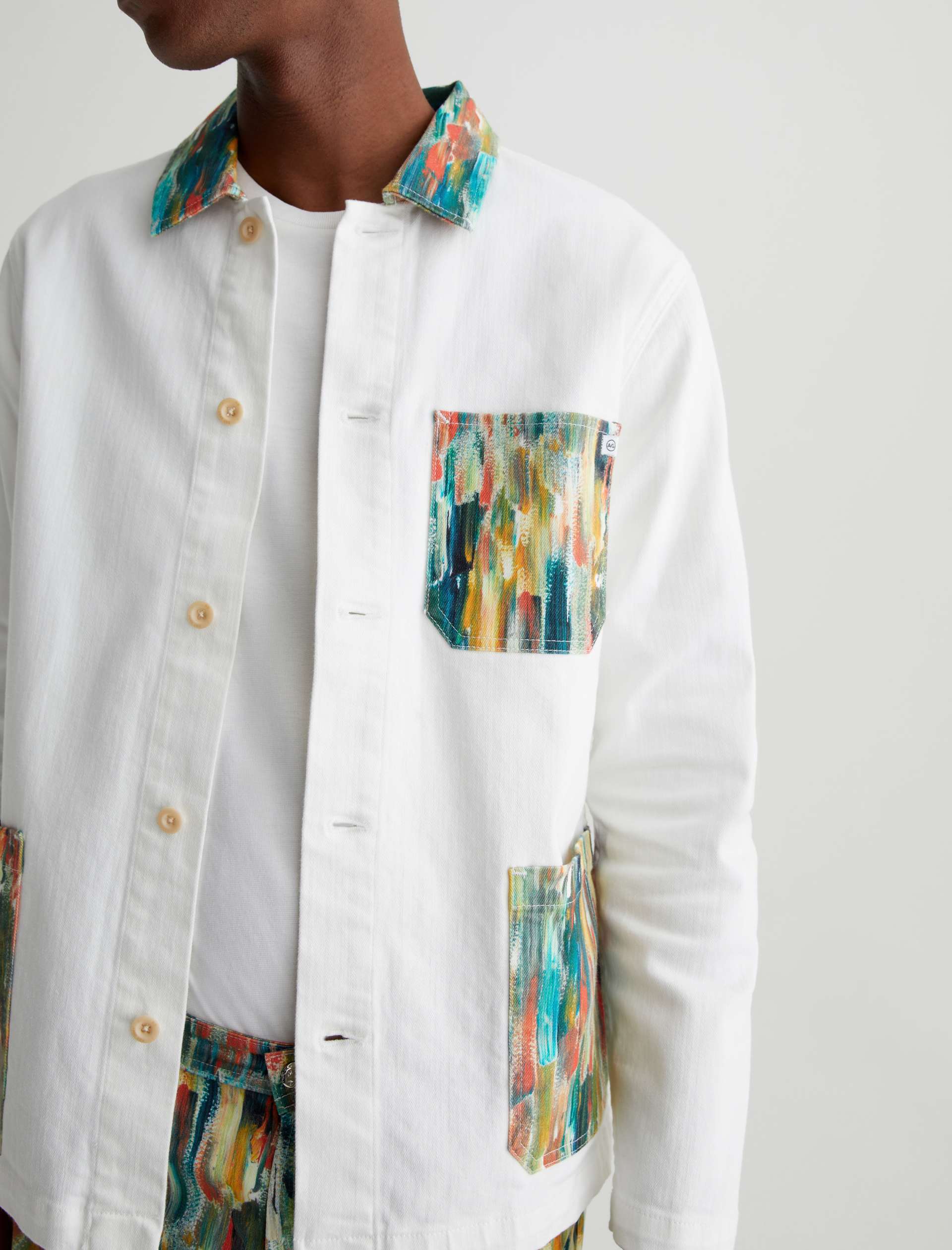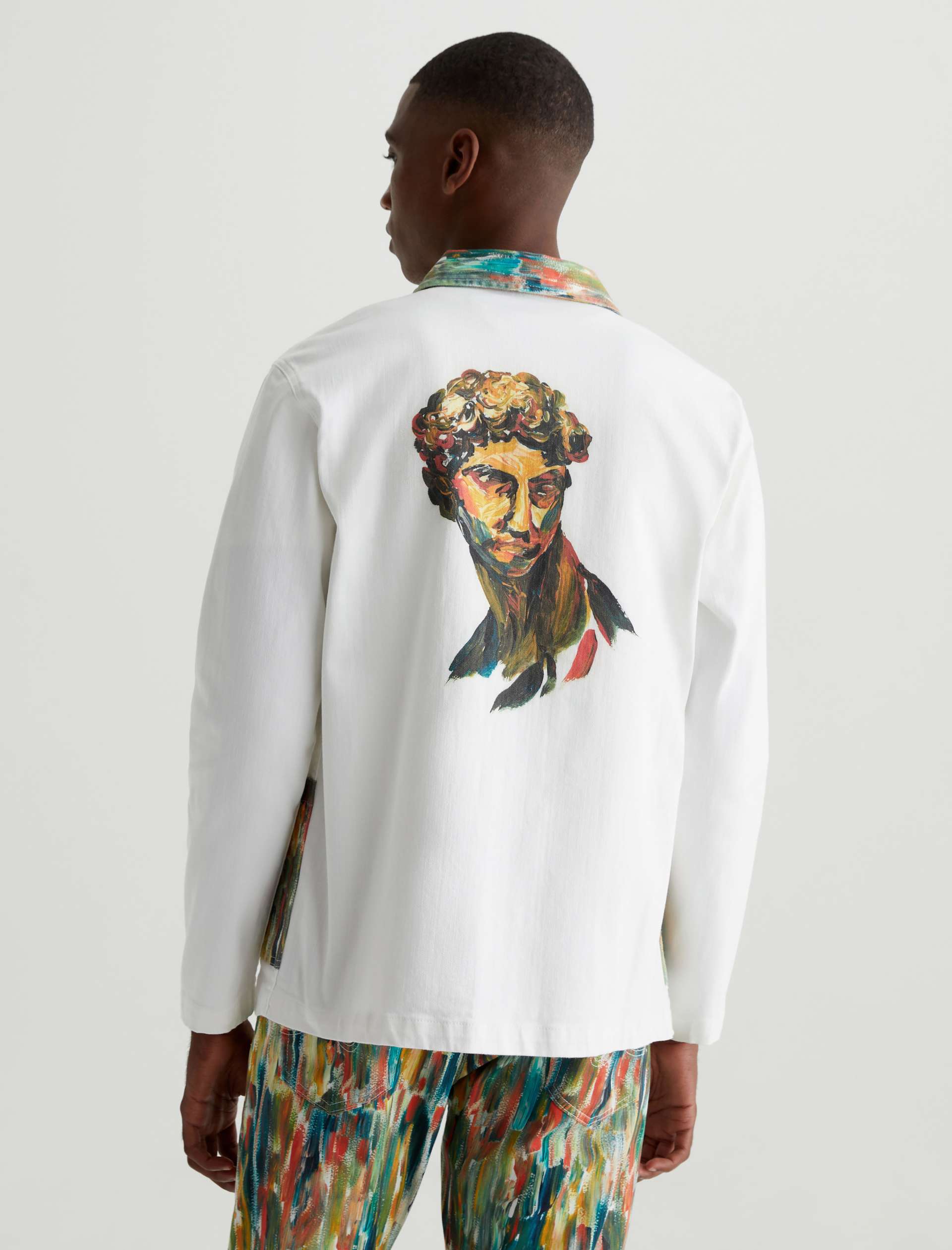 Inspired by the classic French chore coat, the Roari Jacket is updated with printed accents and an artful portrait at the back. This lightweight layer features a loose fit with a slightly longer length and three patch pockets at the front. Fastened by tonal buttons at the front, it’s made from 10 oz. Dover Stretch Deni