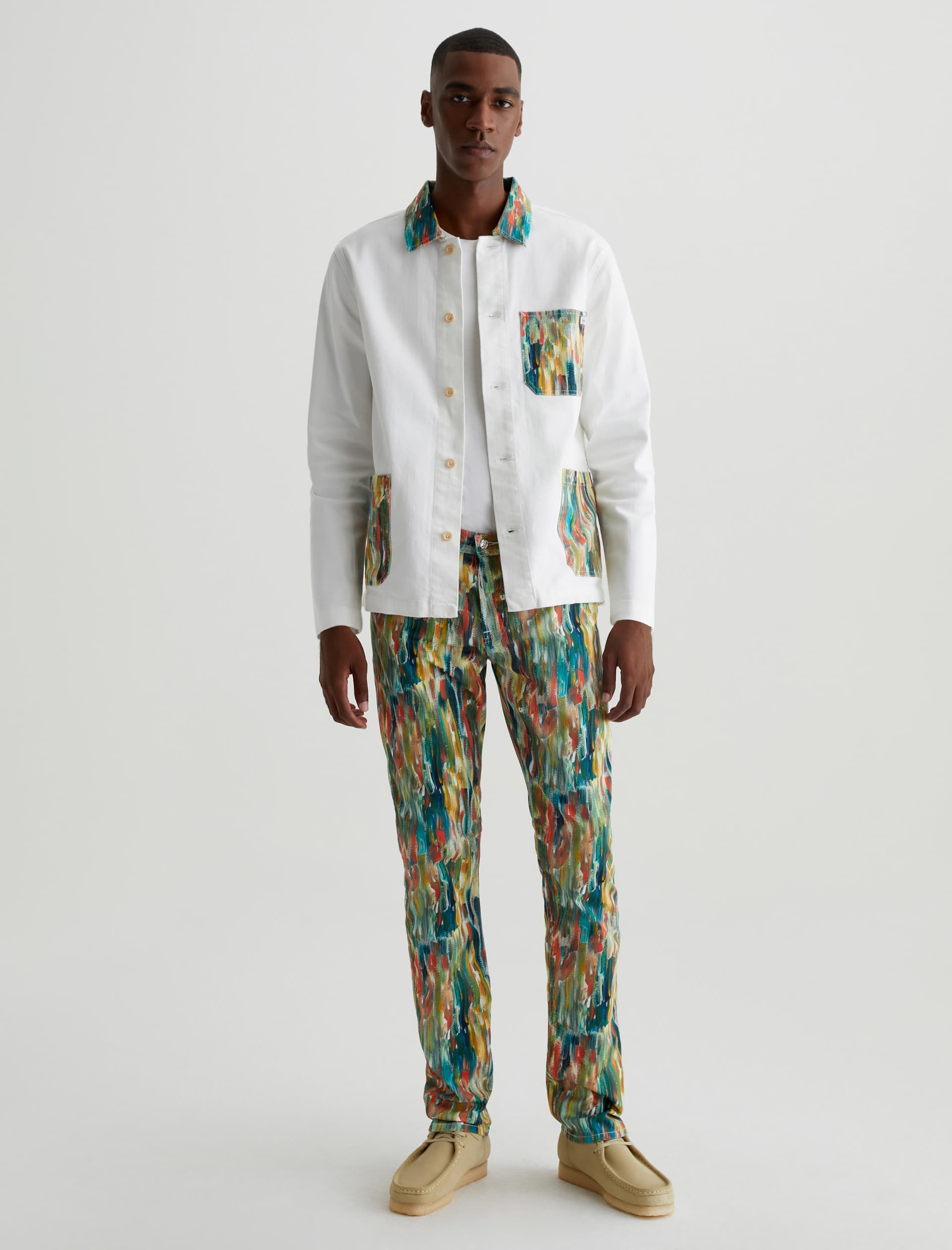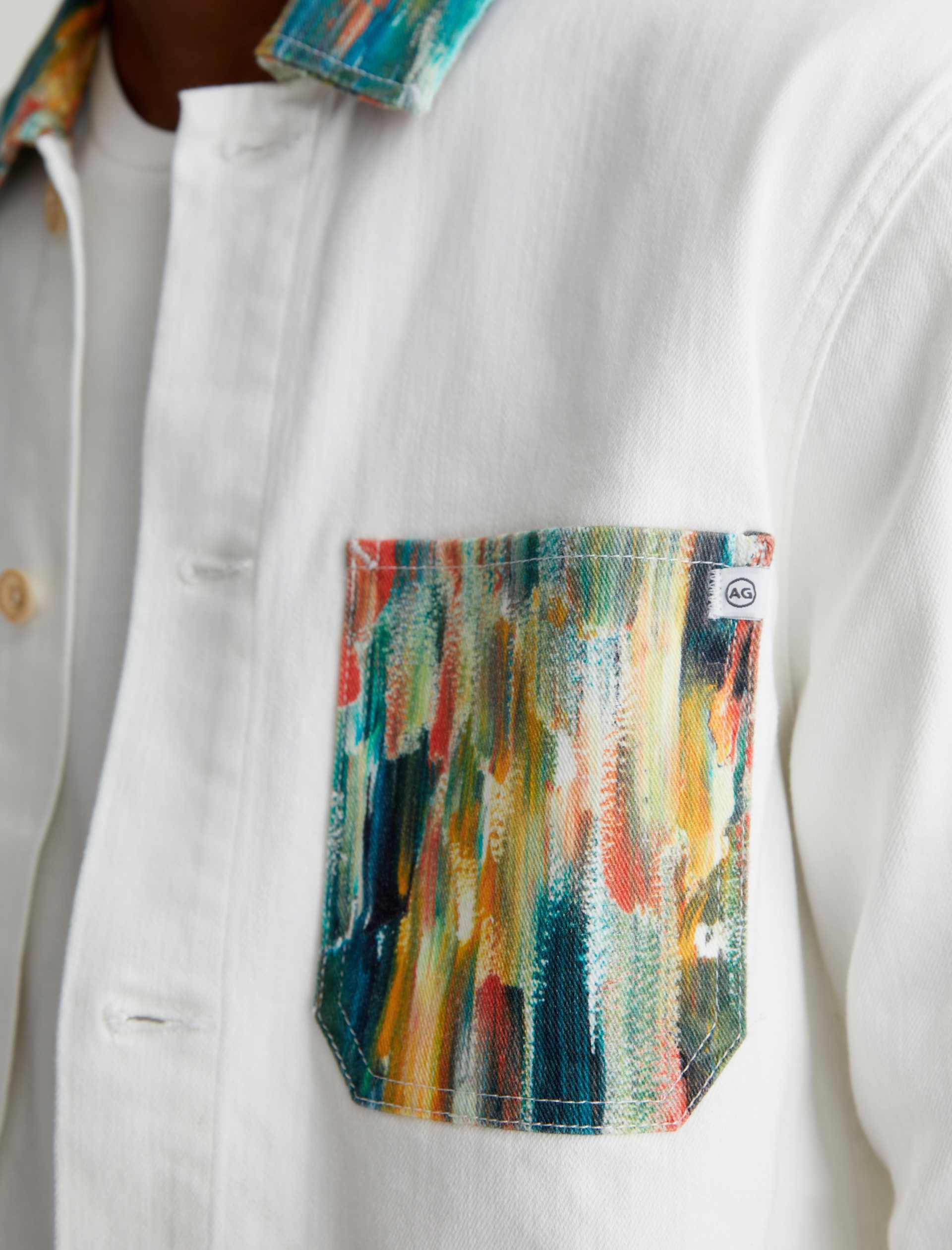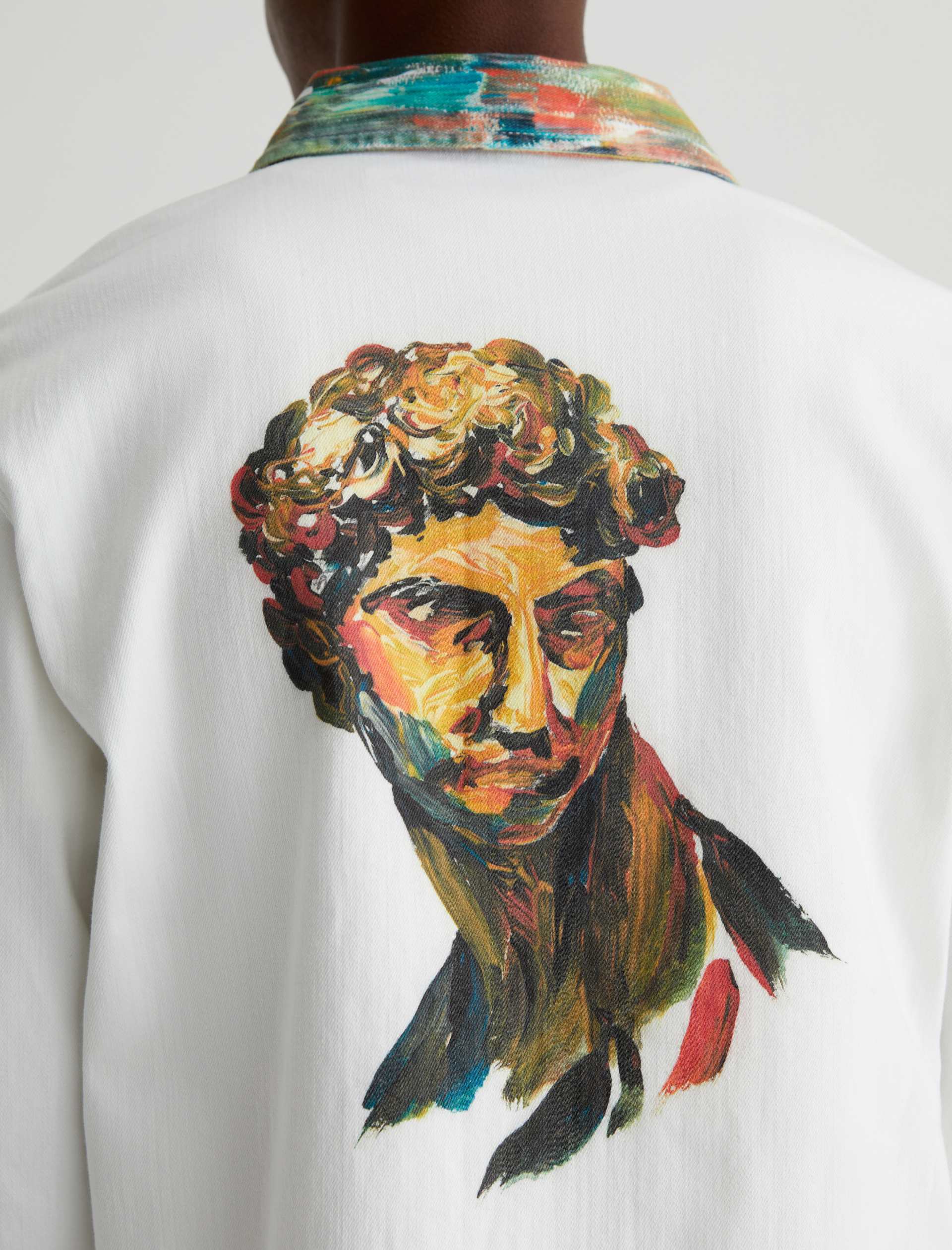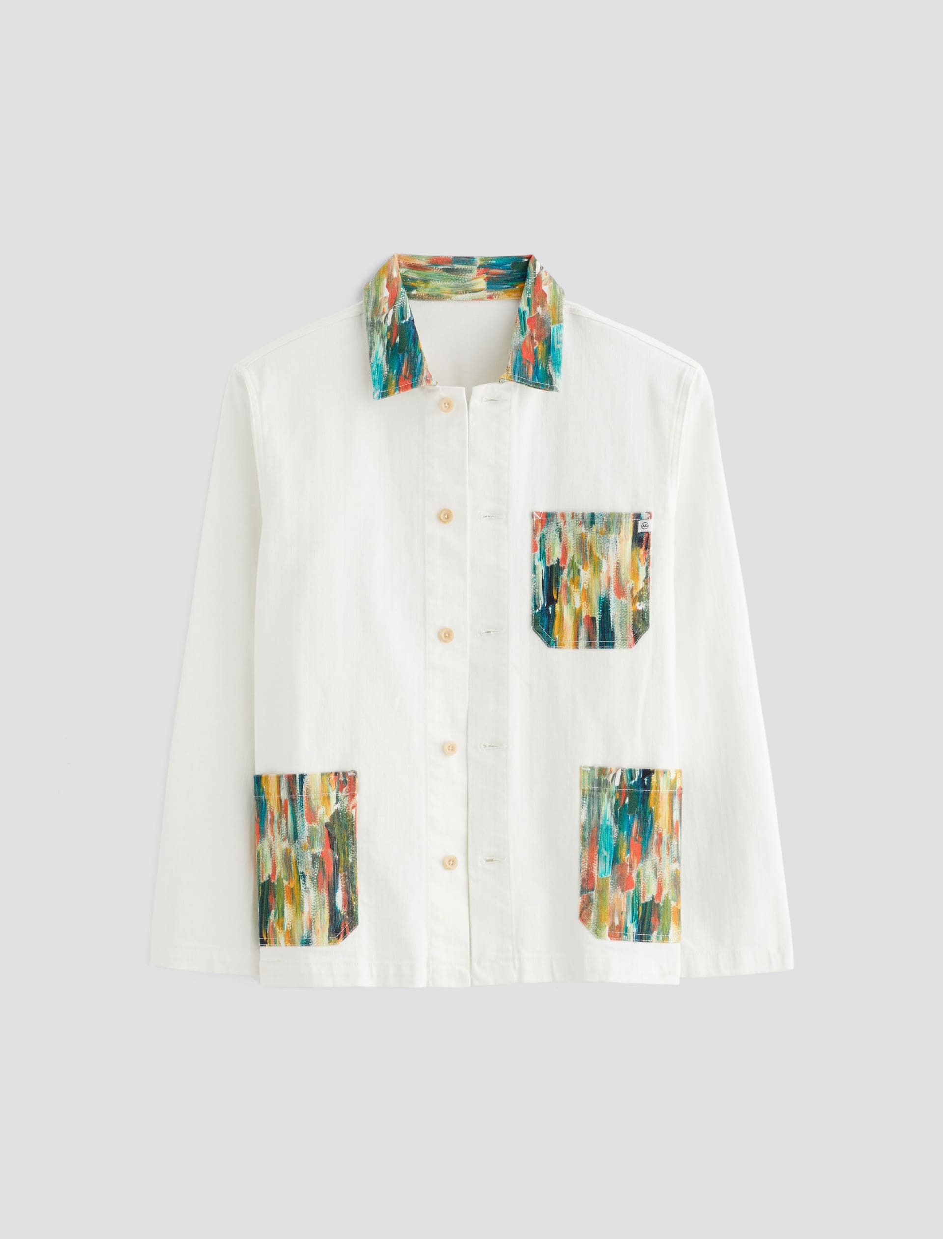 Inspired by the classic French chore coat, the Roari Jacket is updated with printed accents and an artful portrait at the back. This lightweight layer features a loose fit with a slightly longer length and three patch pockets at the front. Fastened by tonal buttons at the front, it’s made from 10 oz. Dover Stretch Deni