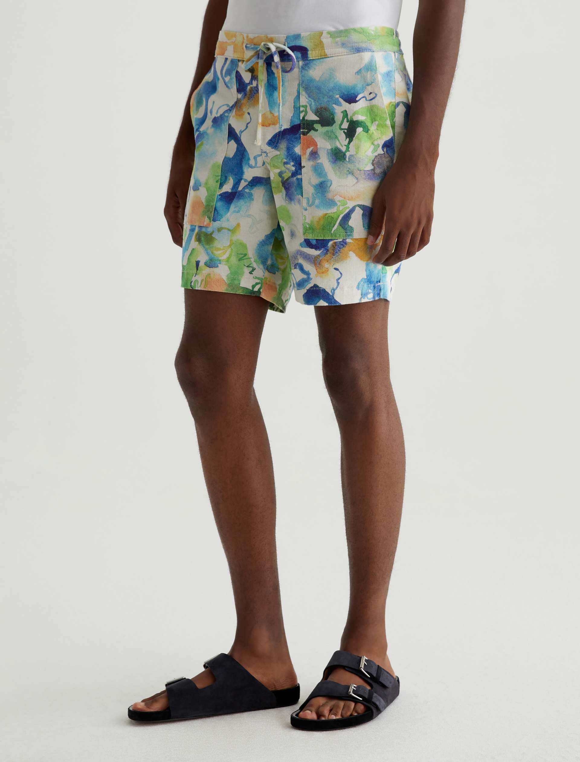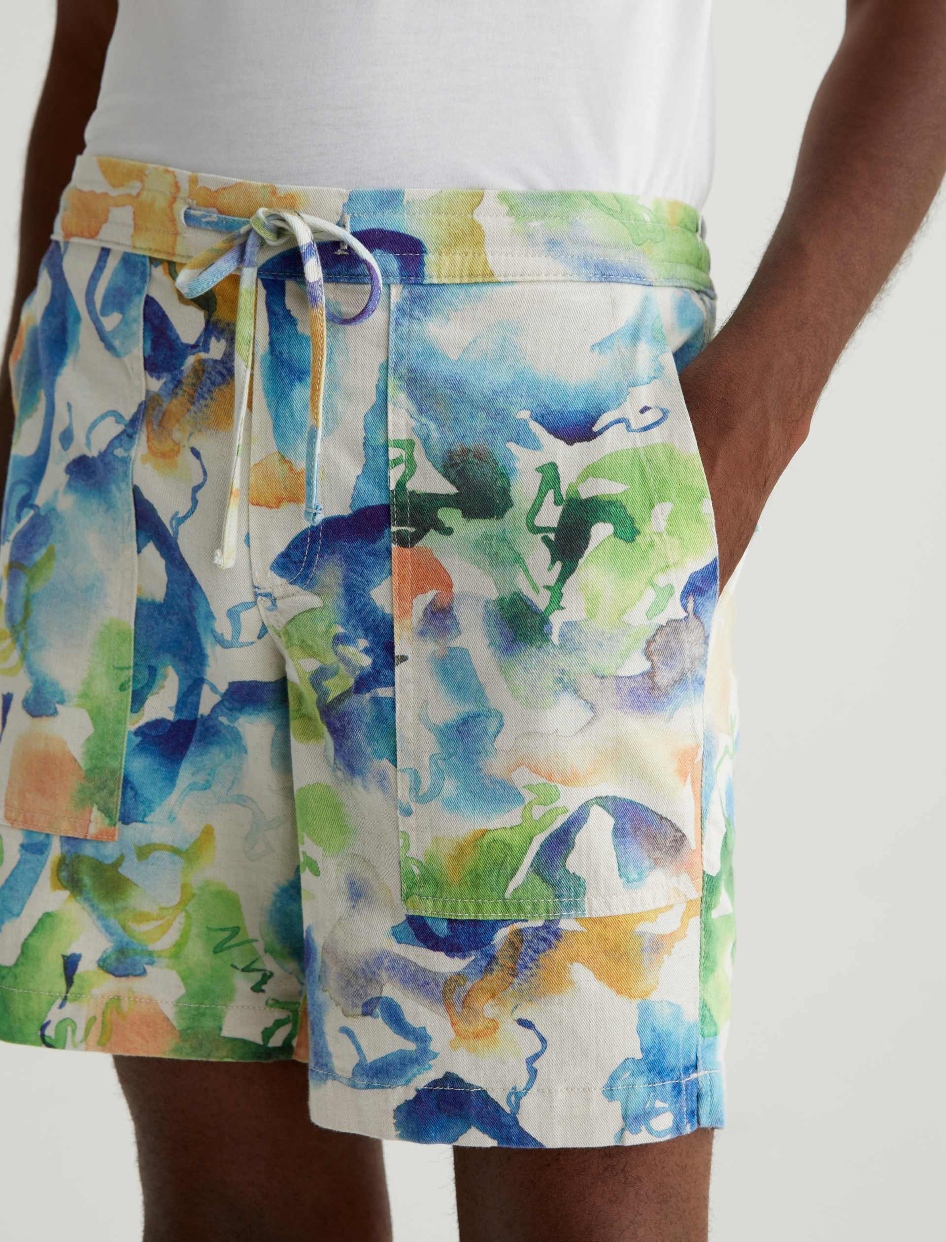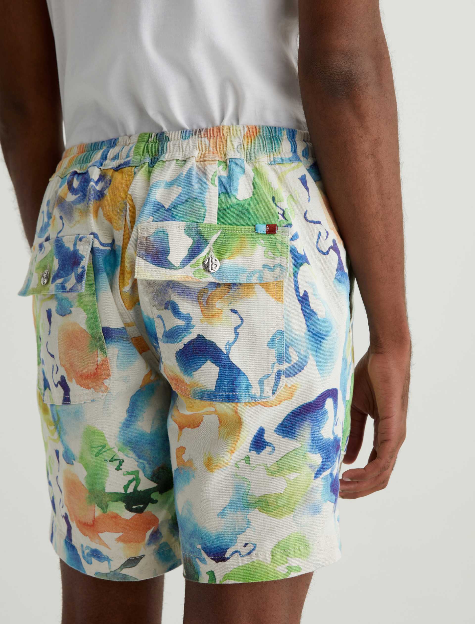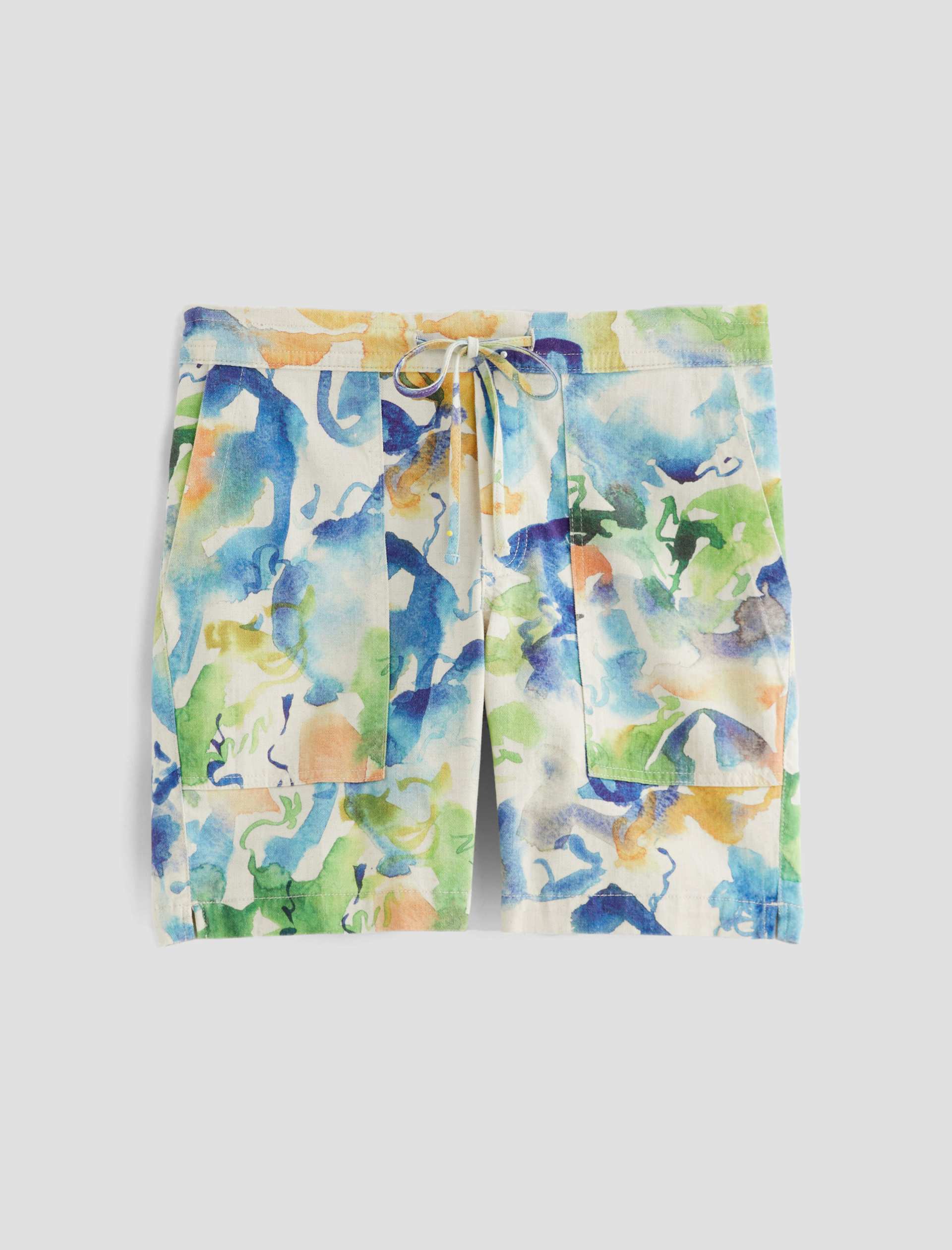 The Wells Drawstring Short is cut from a soft linen-blend stretch twill with a cool watercolor print. Cut for a lounge-ready relaxed fit, this pull-on style has fatigue front pockets and a partially elasticized waistband. Buttoned flap pockets at the back complete the look. About the Art Project print: Watercolor’s flo