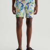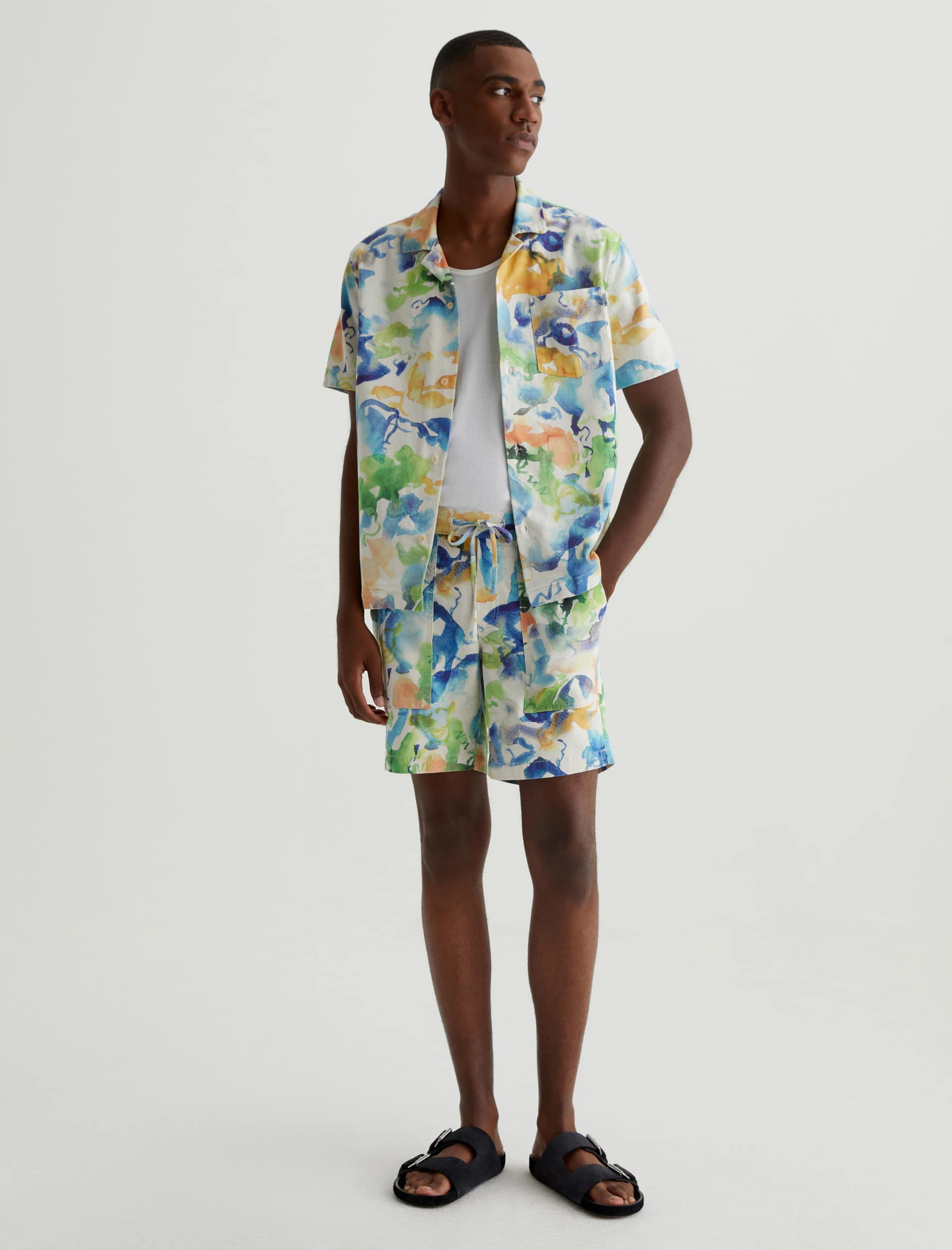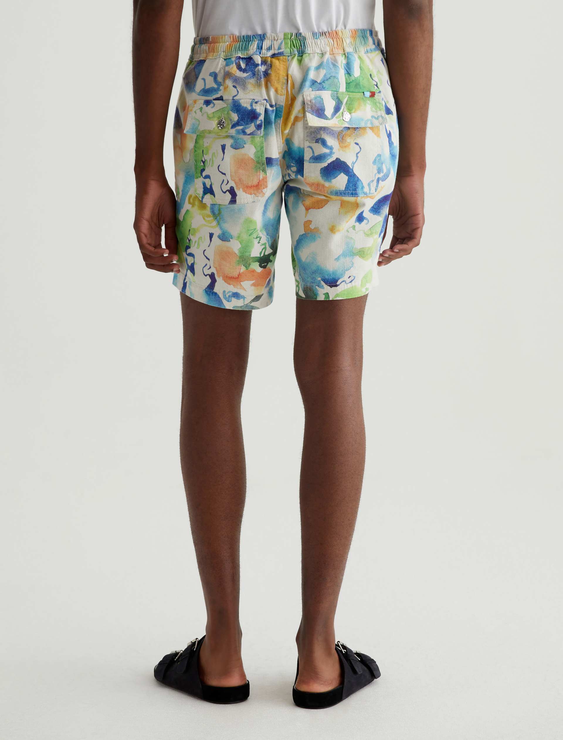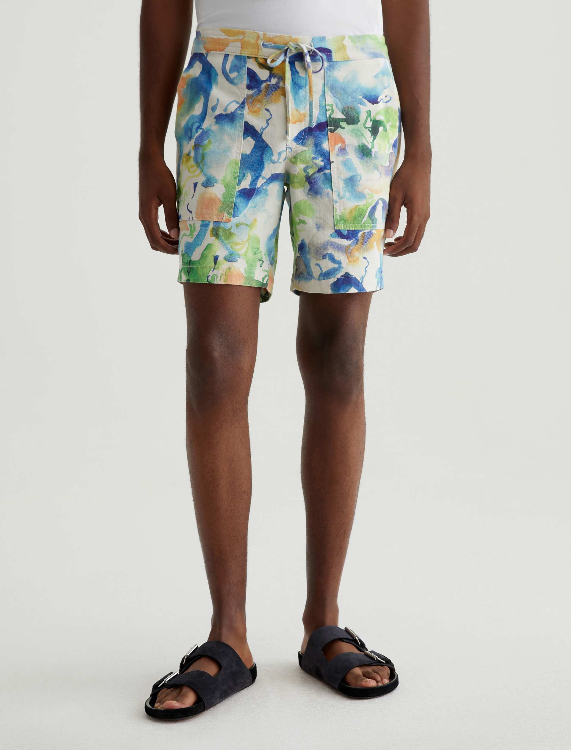The Wells Drawstring Short is cut from a soft linen-blend stretch twill with a cool watercolor print. Cut for a lounge-ready relaxed fit, this pull-on style has fatigue front pockets and a partially elasticized waistband. Buttoned flap pockets at the back complete the look. About the Art Project print: Watercolor’s flo