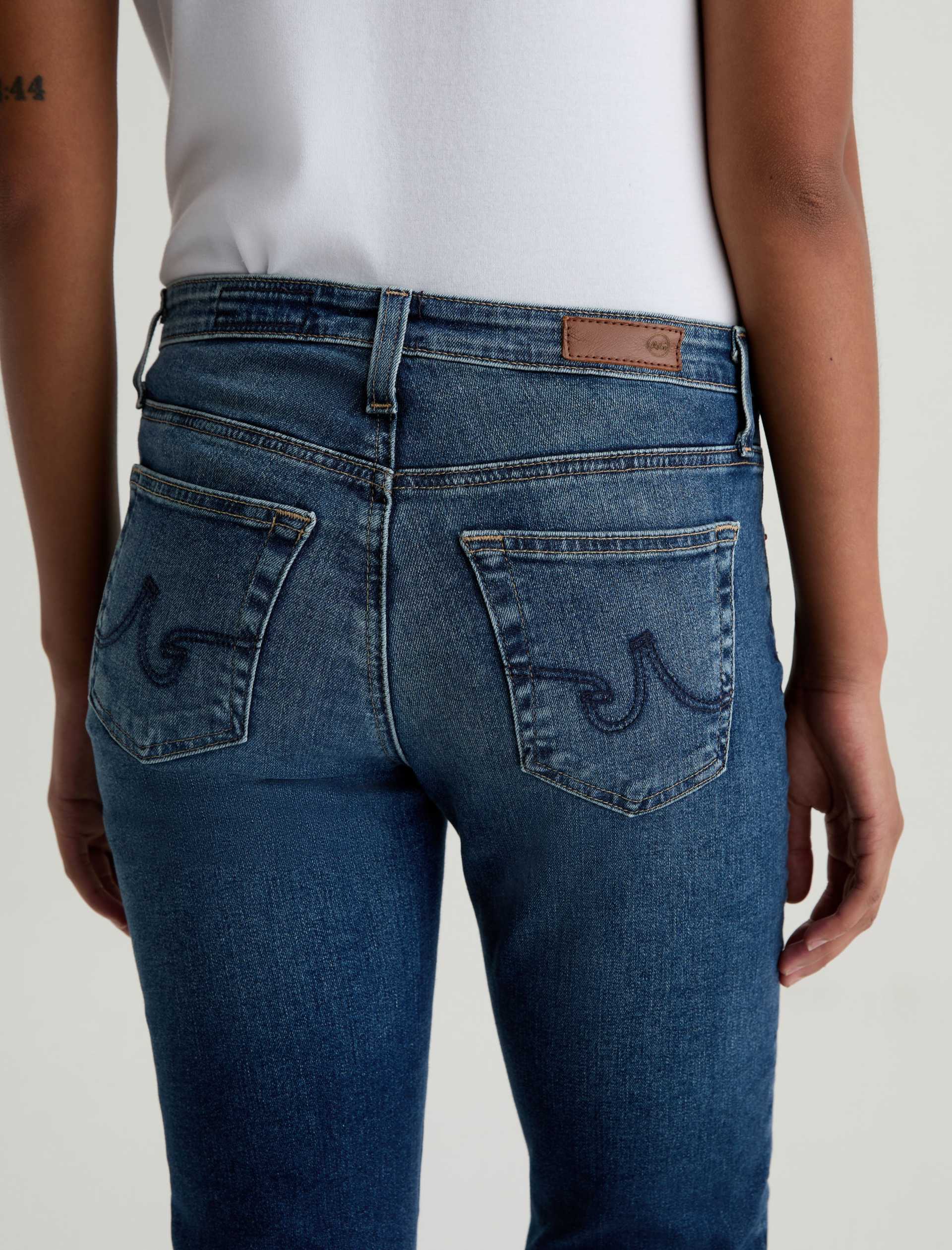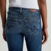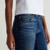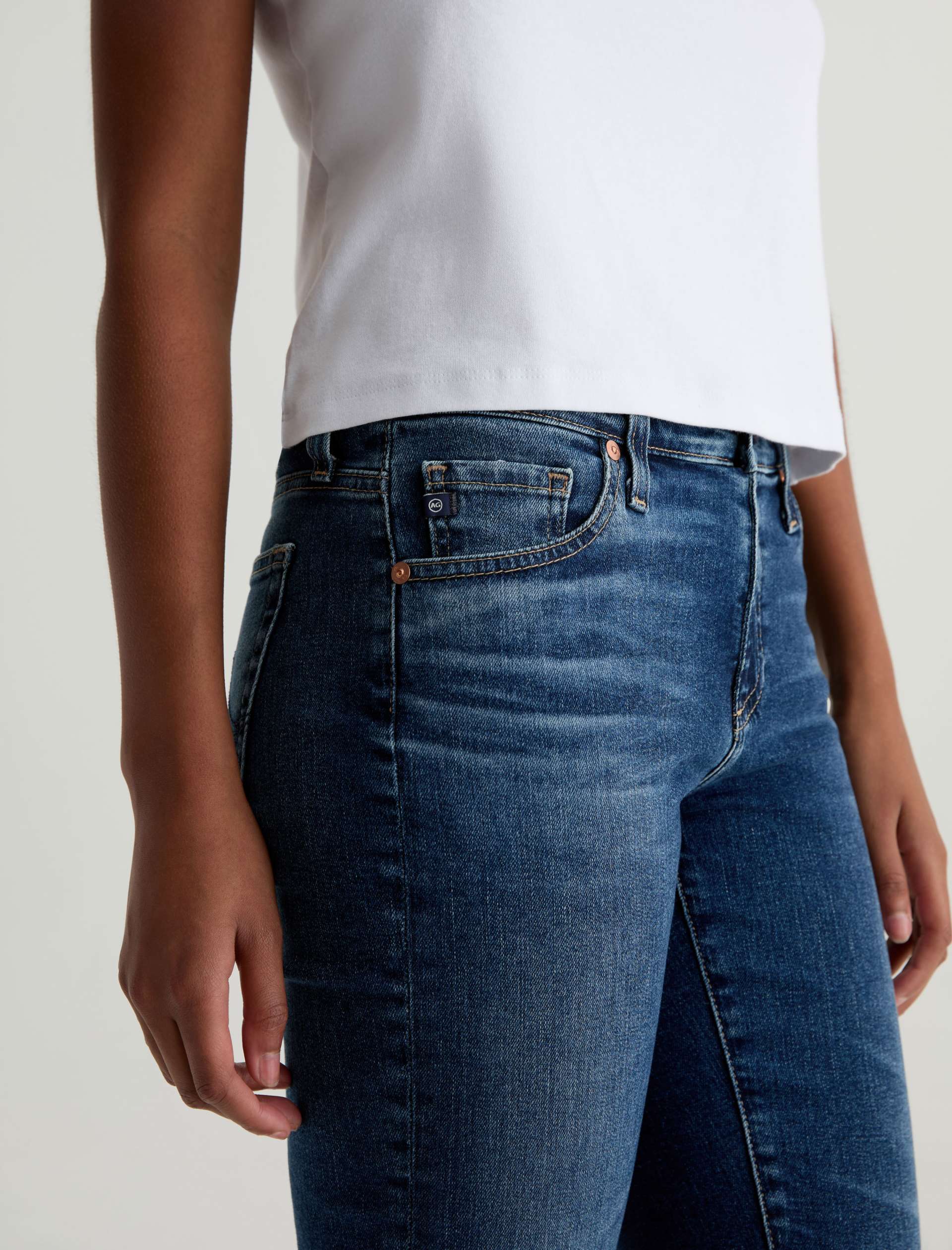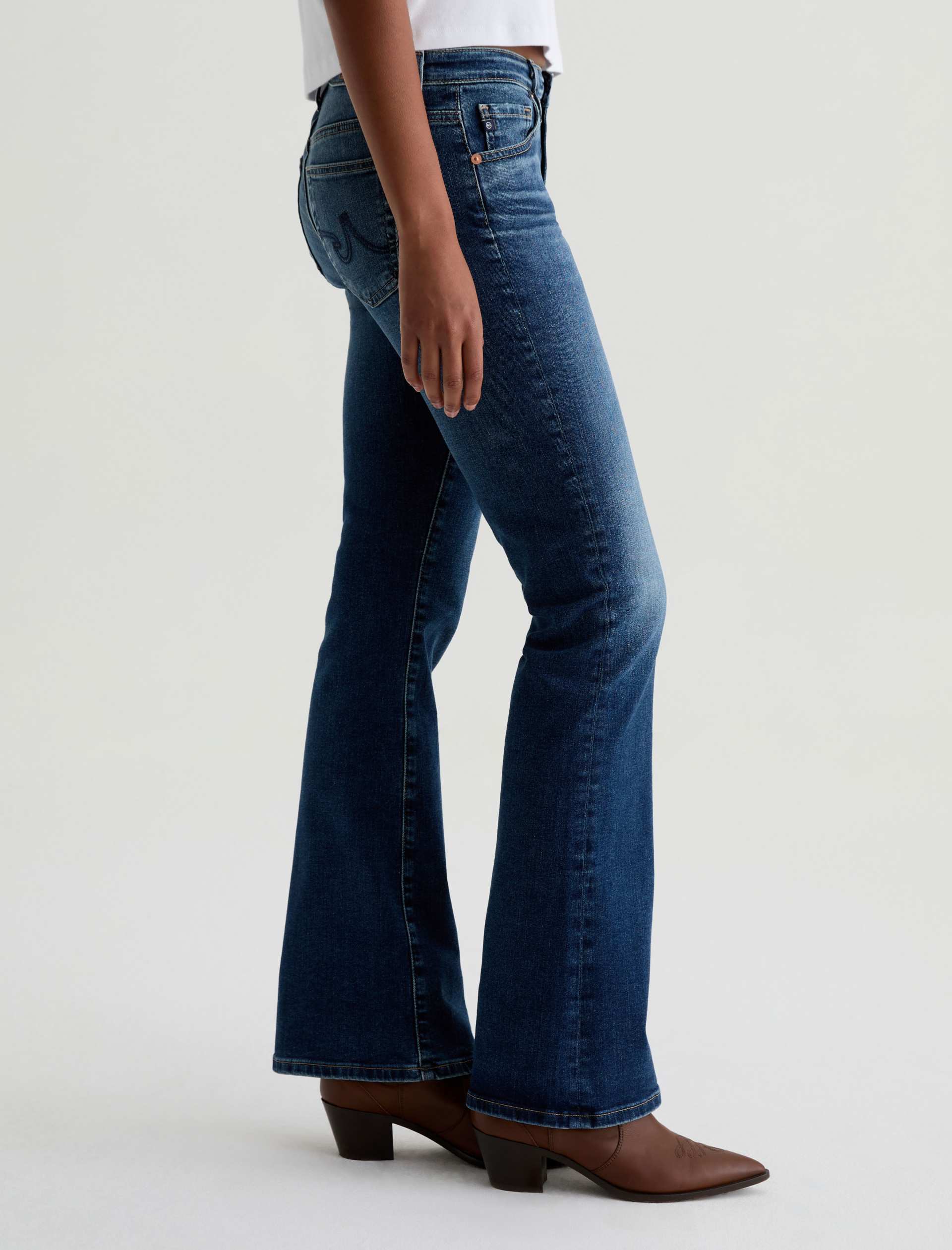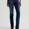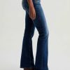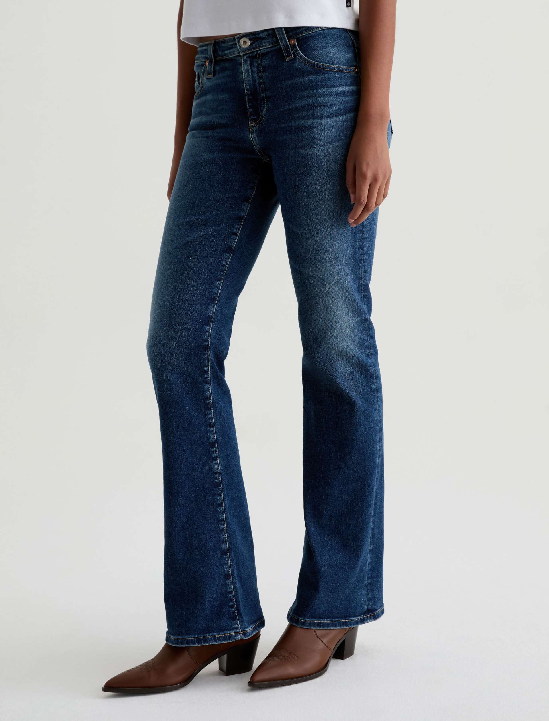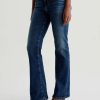 Our Angel low-rise bootcut silhouette features a dark blue wash with fading and whiskering. Cut from 10 oz. Empower Denim, these five-pocket jeans are blended with stretch for a shape-hugging silhouette and premium recovery. Classic marigold topstitching finishes the look.