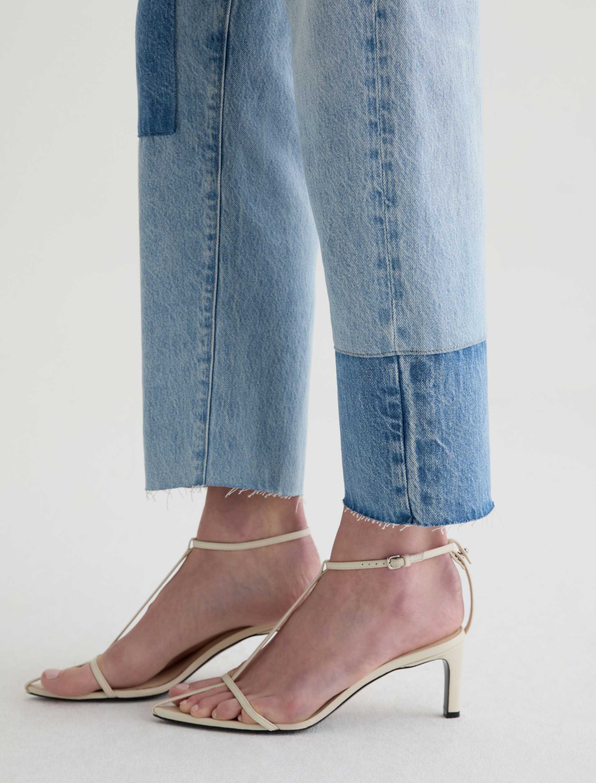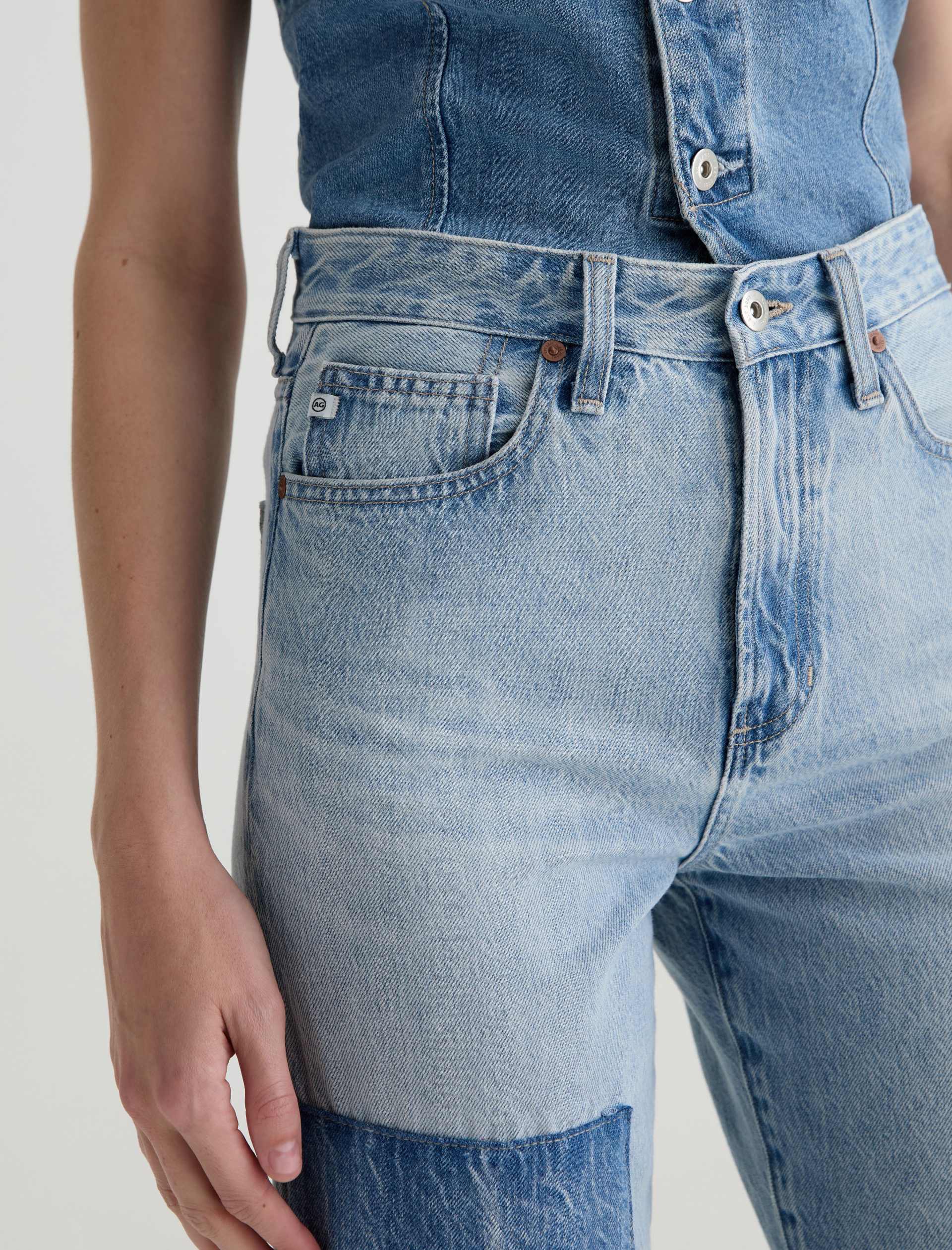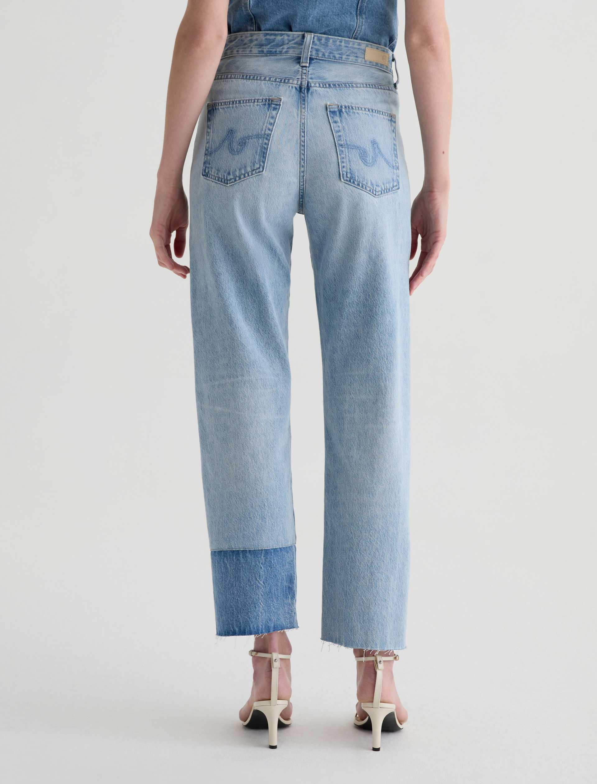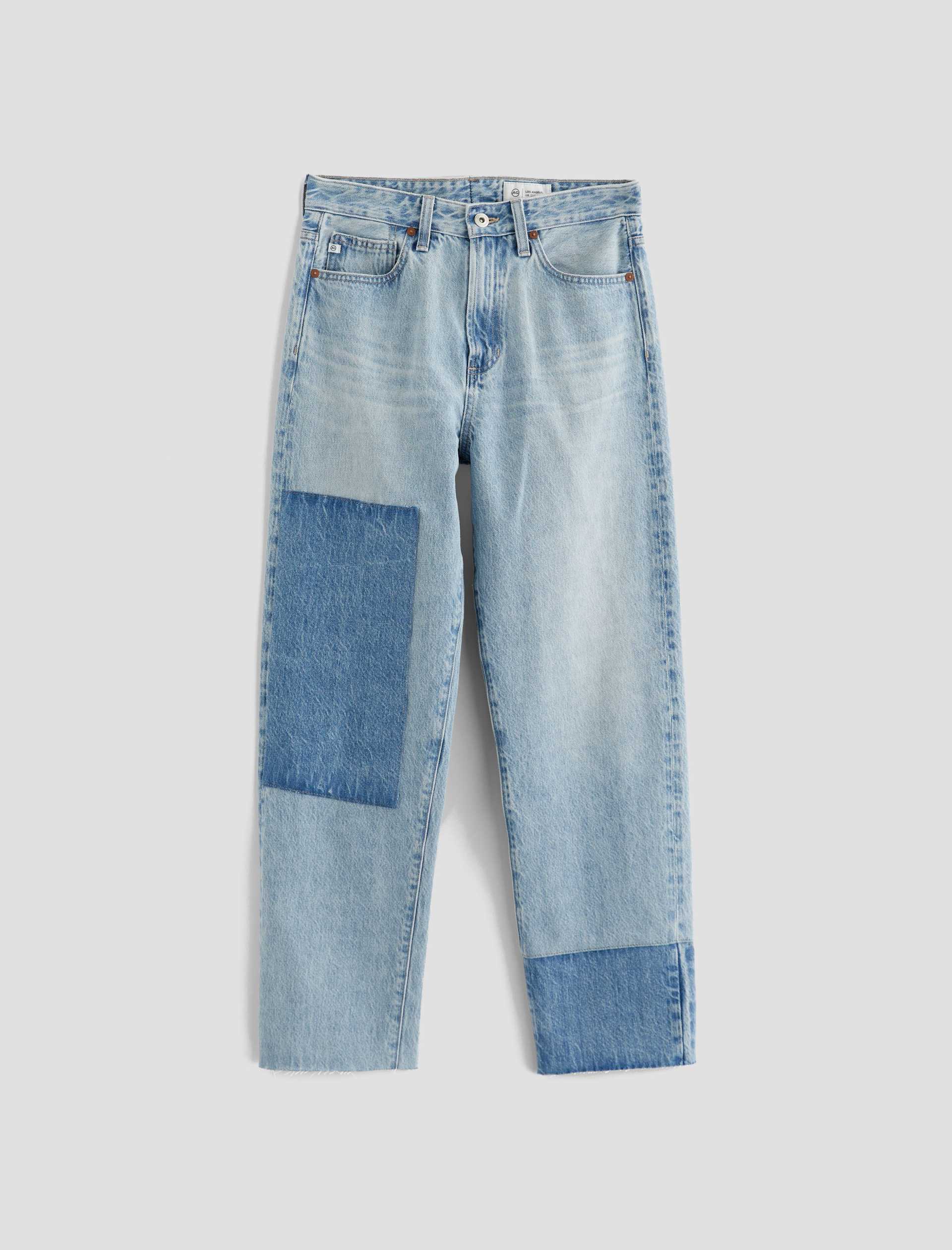 Brinley Patchwork is a mid-rise straight jean crafted from Italian non-stretch denim in a light wash. It features patchwork detailing in a contrasting denim shade on both legs, frayed hems, and an ankle-grazing length for a laid-back finish.