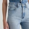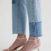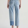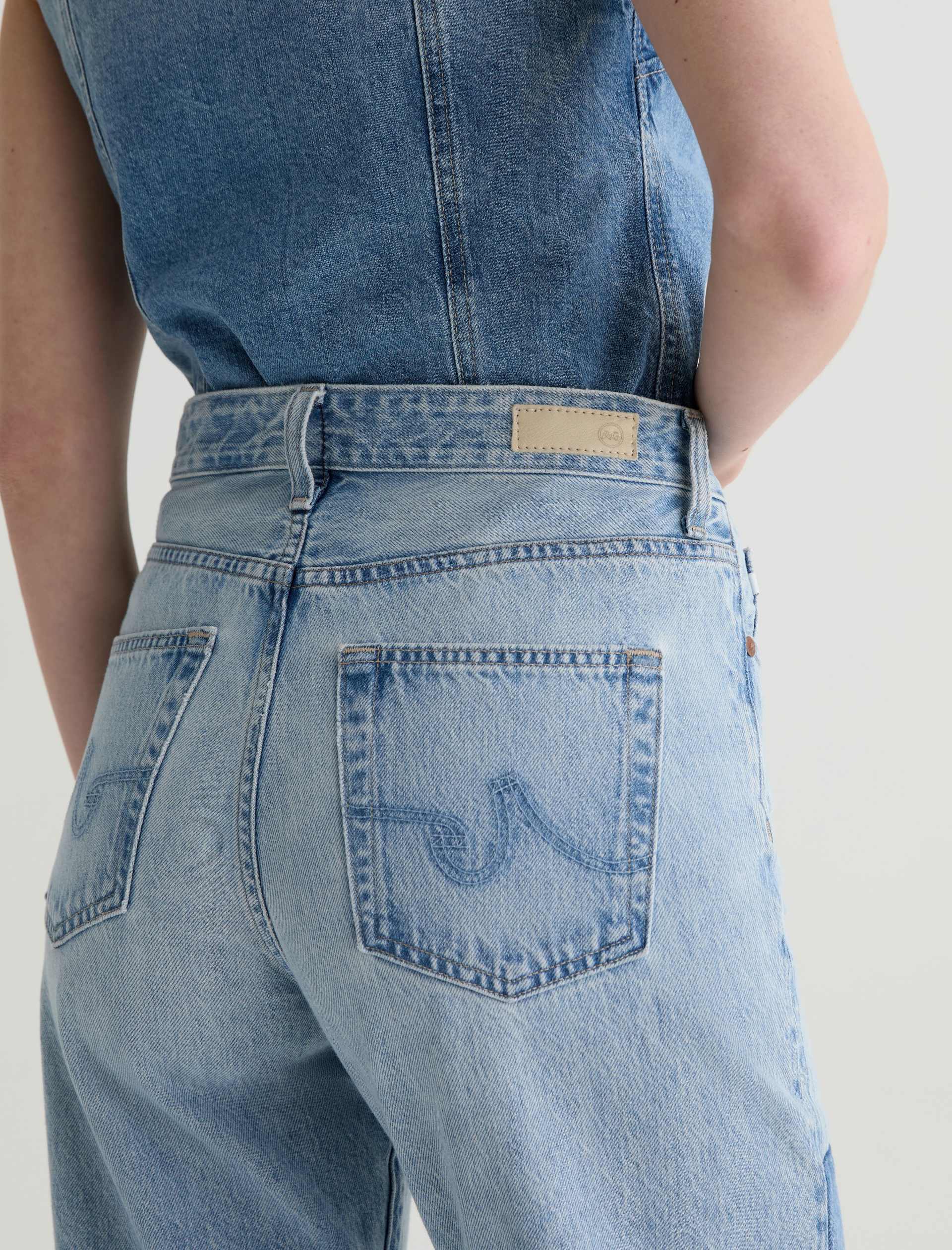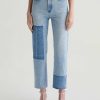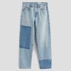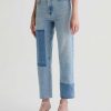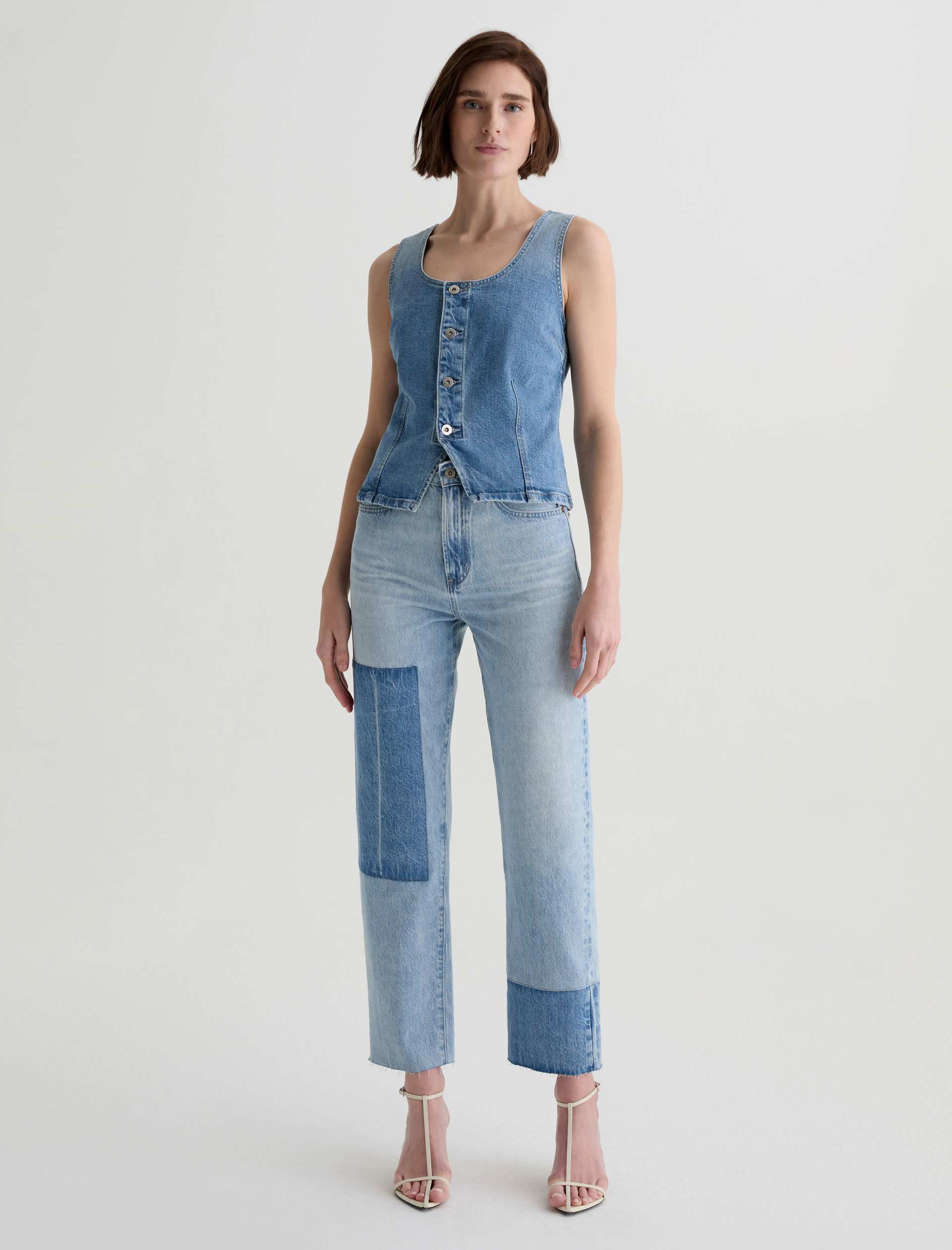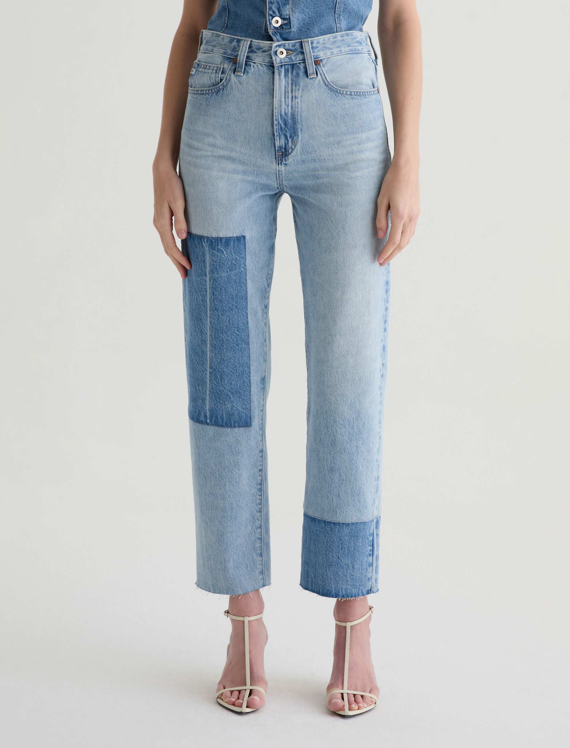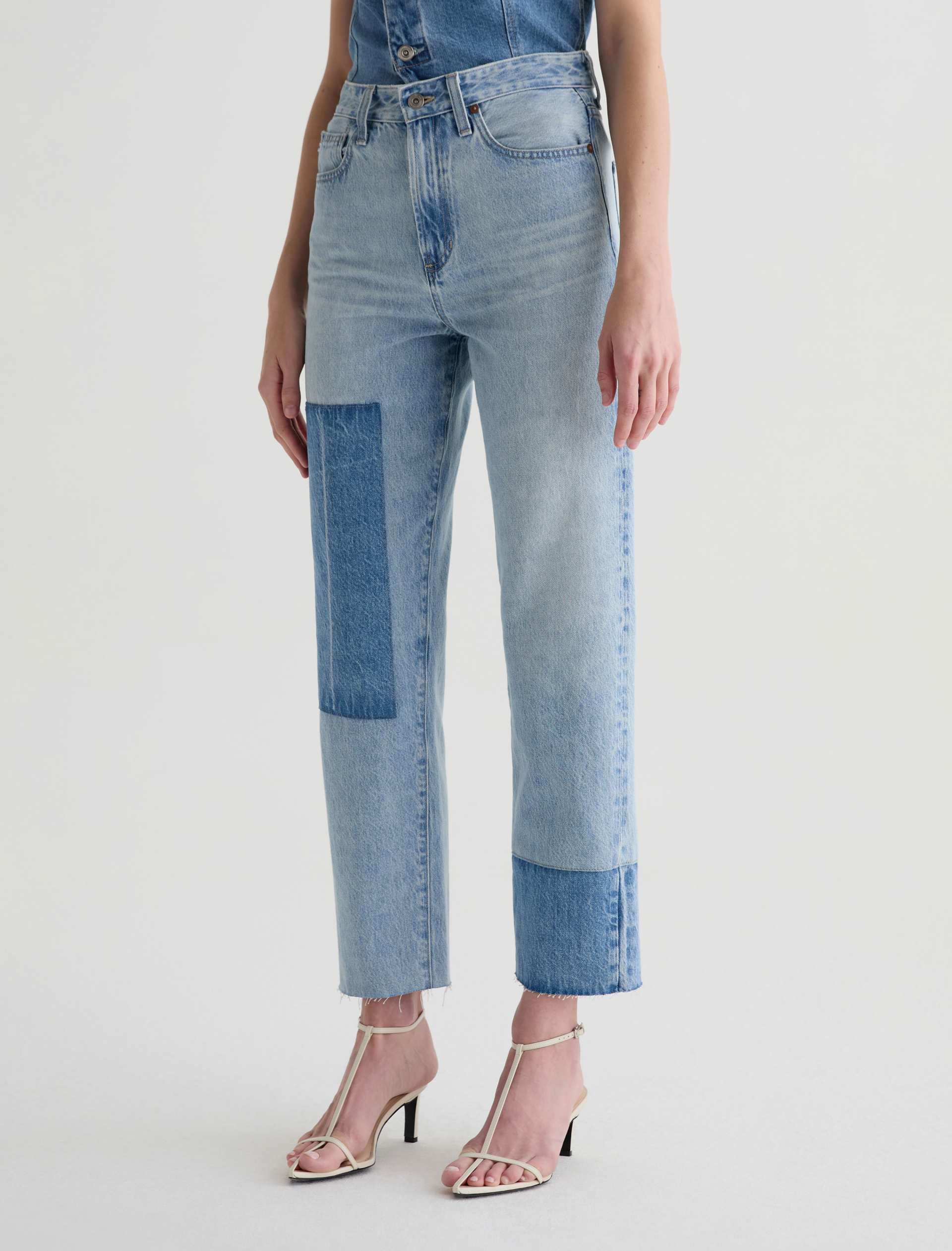 Brinley Patchwork is a mid-rise straight jean crafted from Italian non-stretch denim in a light wash. It features patchwork detailing in a contrasting denim shade on both legs, frayed hems, and an ankle-grazing length for a laid-back finish.
