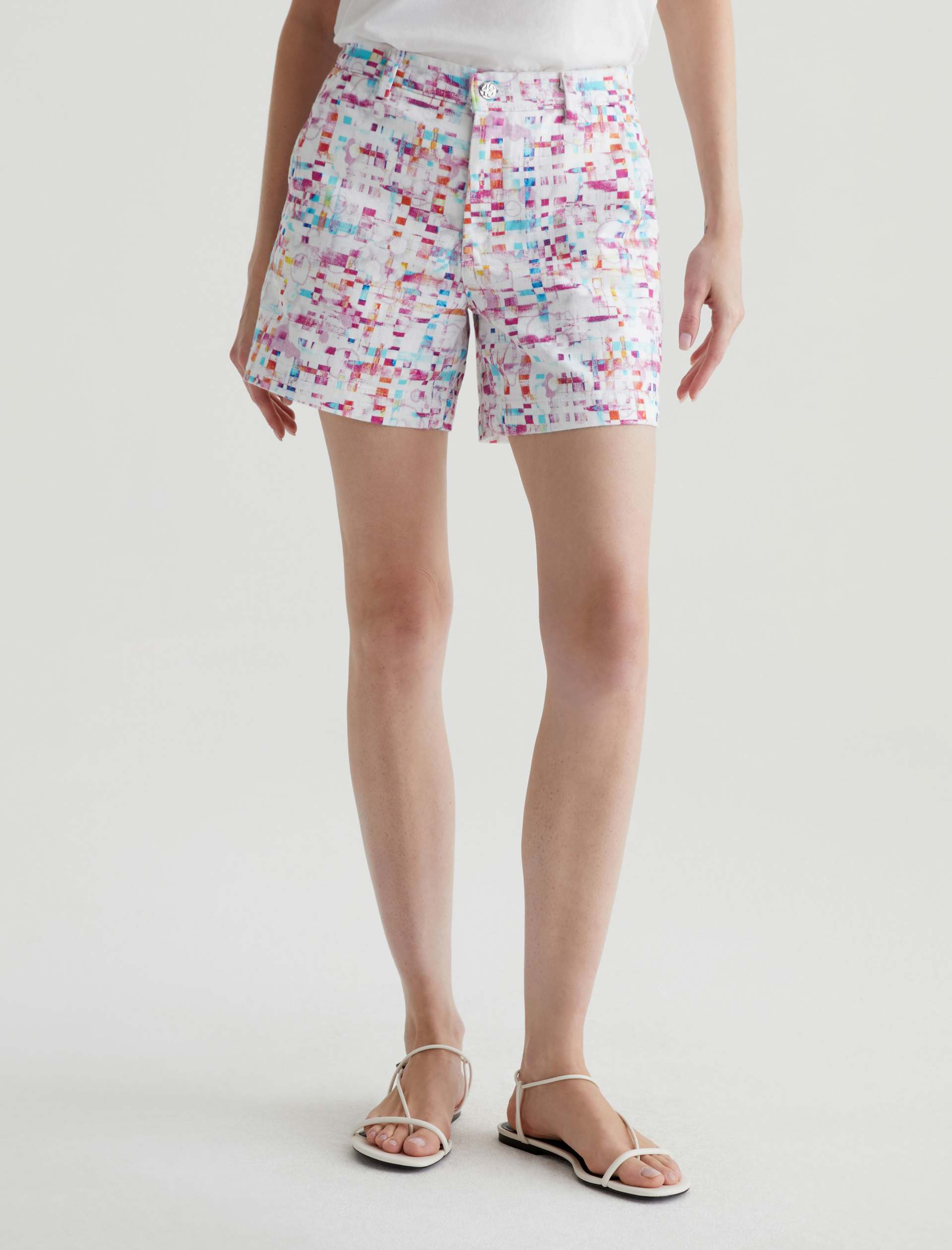 Our Caden tailored shorts for women in a vibrant check motif. These women’s shorts have a relaxed fit through the hips and slight tapering at the thighs. Crafted from comfortable Dover Stretch Denim, this pair are designed with slant front pockets and welt pockets at the back. About the Art Project print: Bright colors
