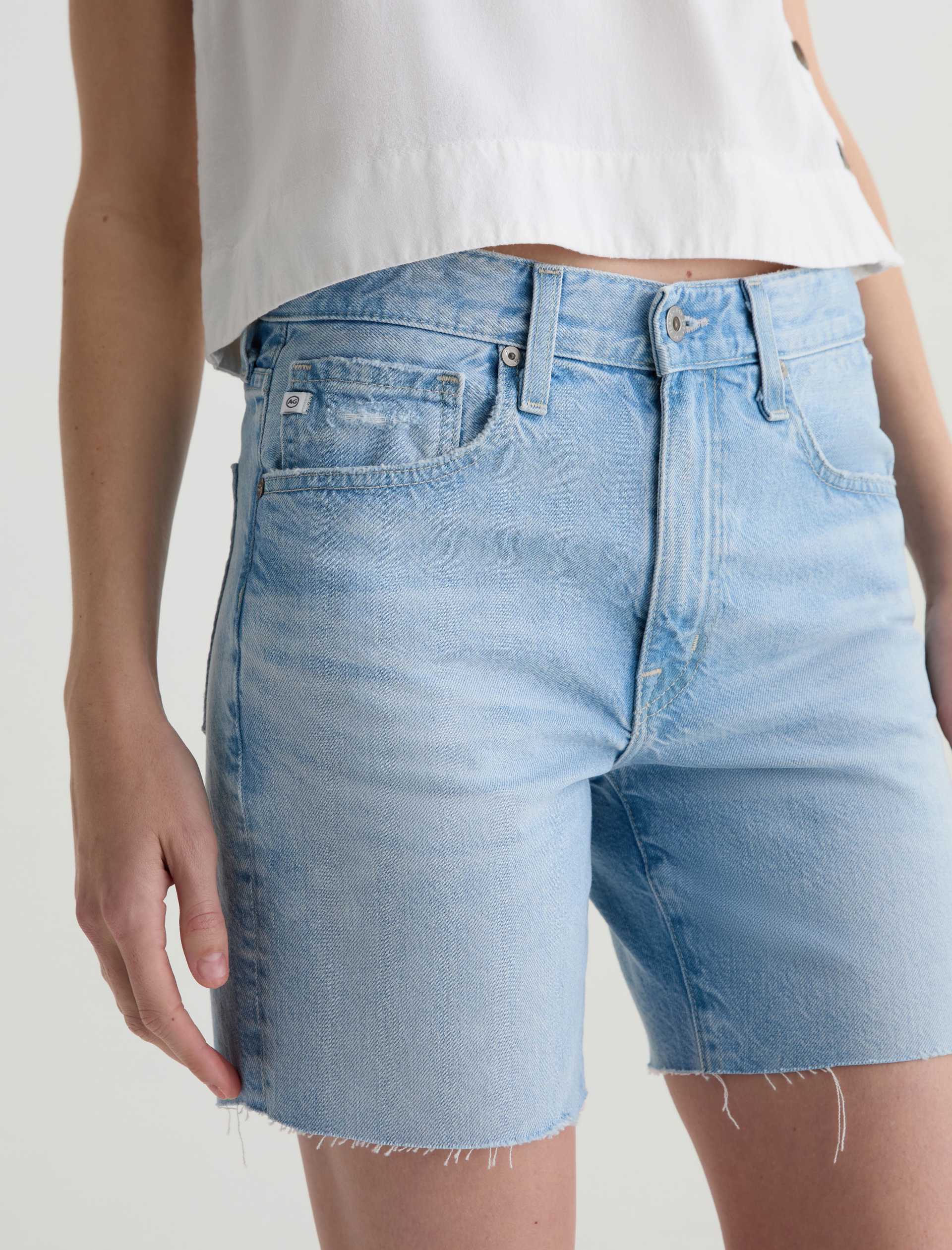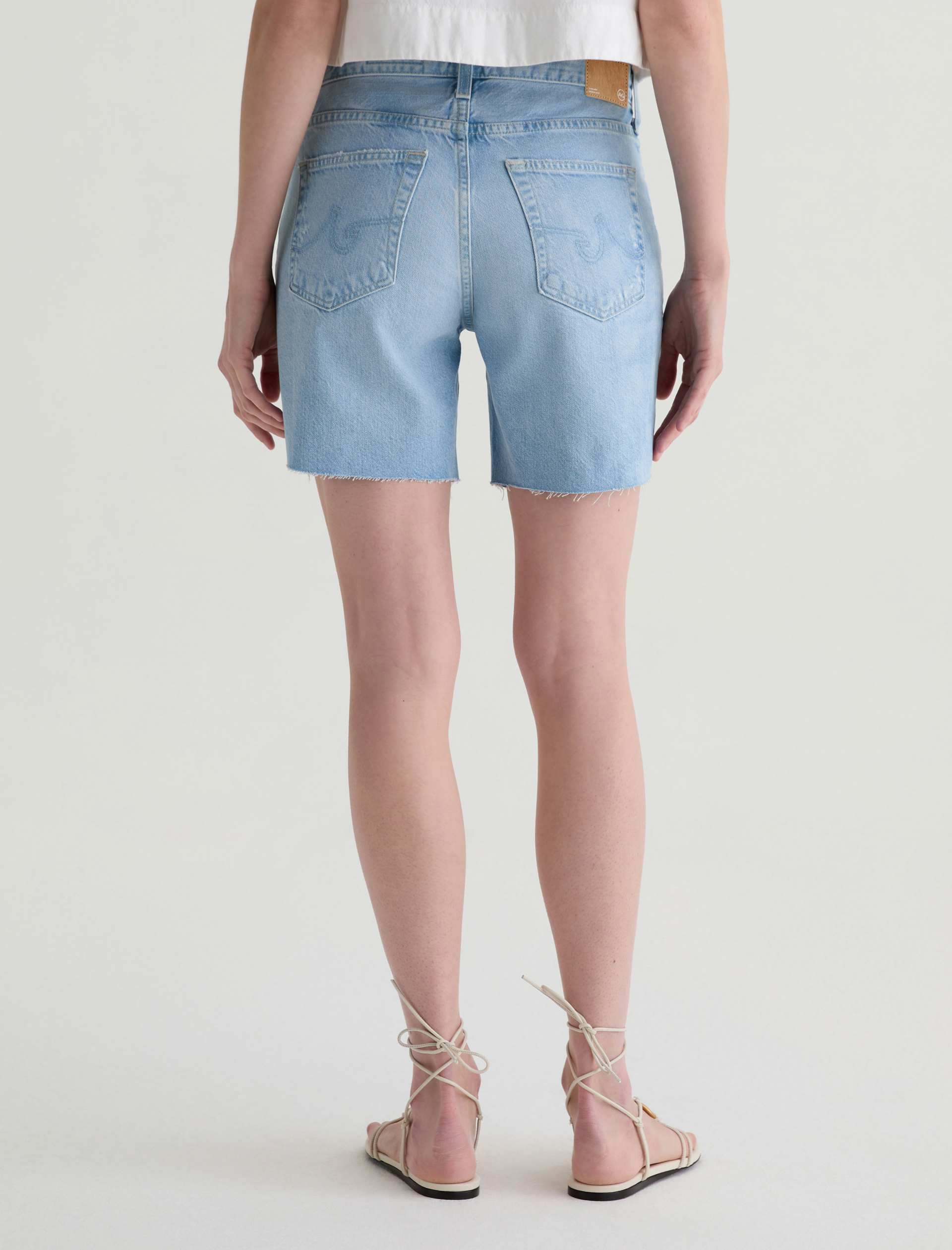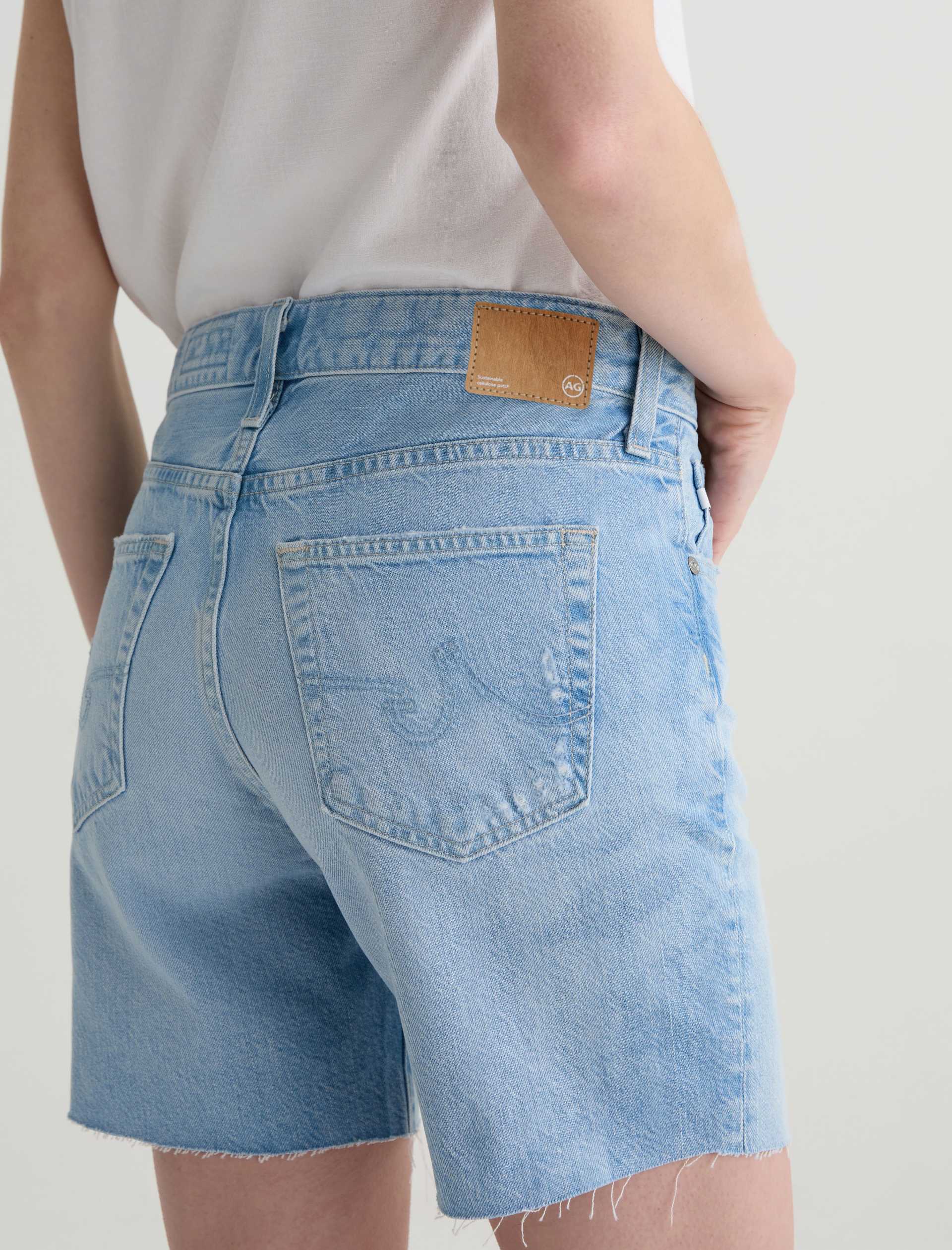 The Ex-Boyfriend Short is a mid-rise Bermuda style with a 7” inseam and raw hems. Crafted from comfort stretch denim in a light blue wash for a relaxed, worn-in feel.