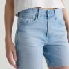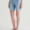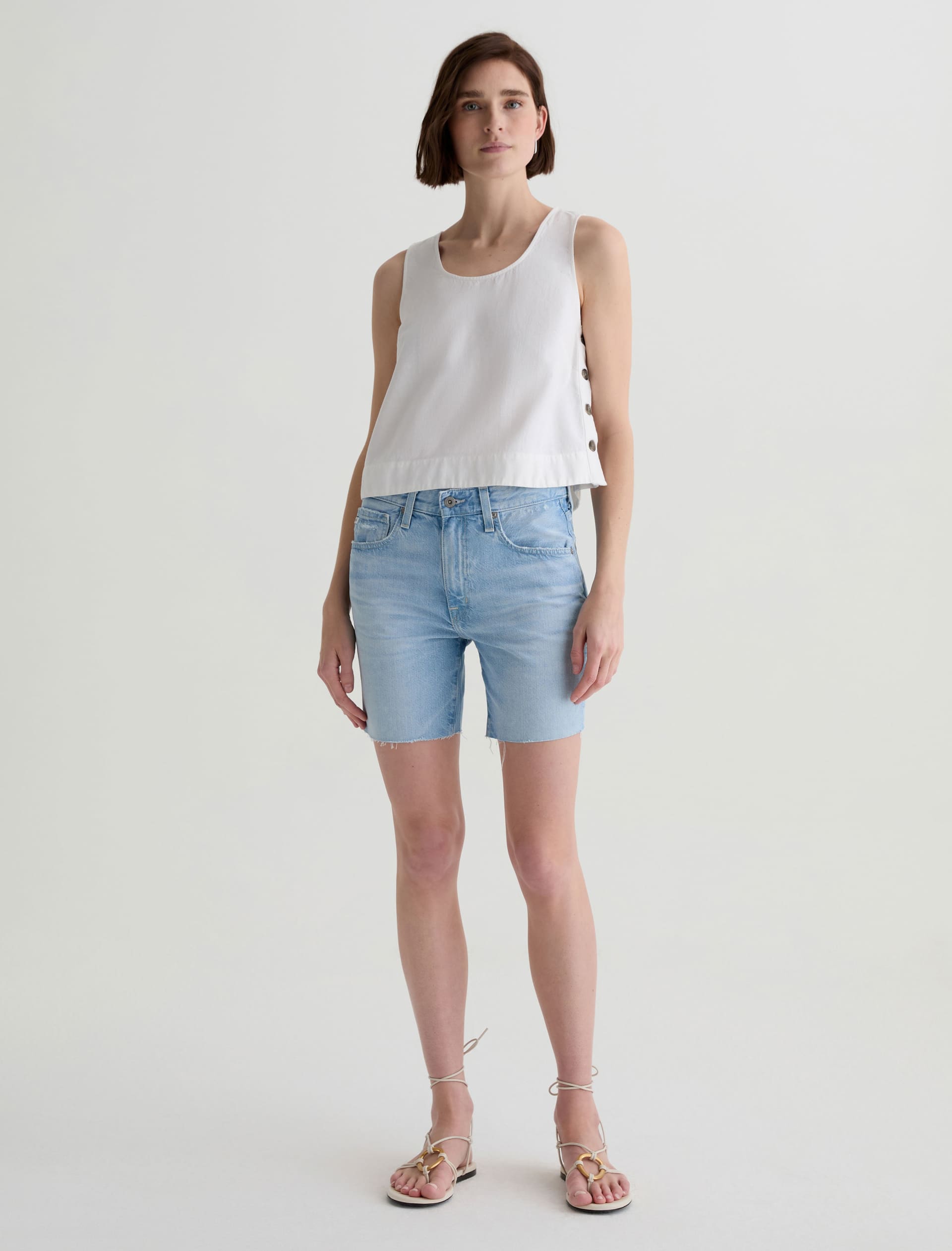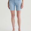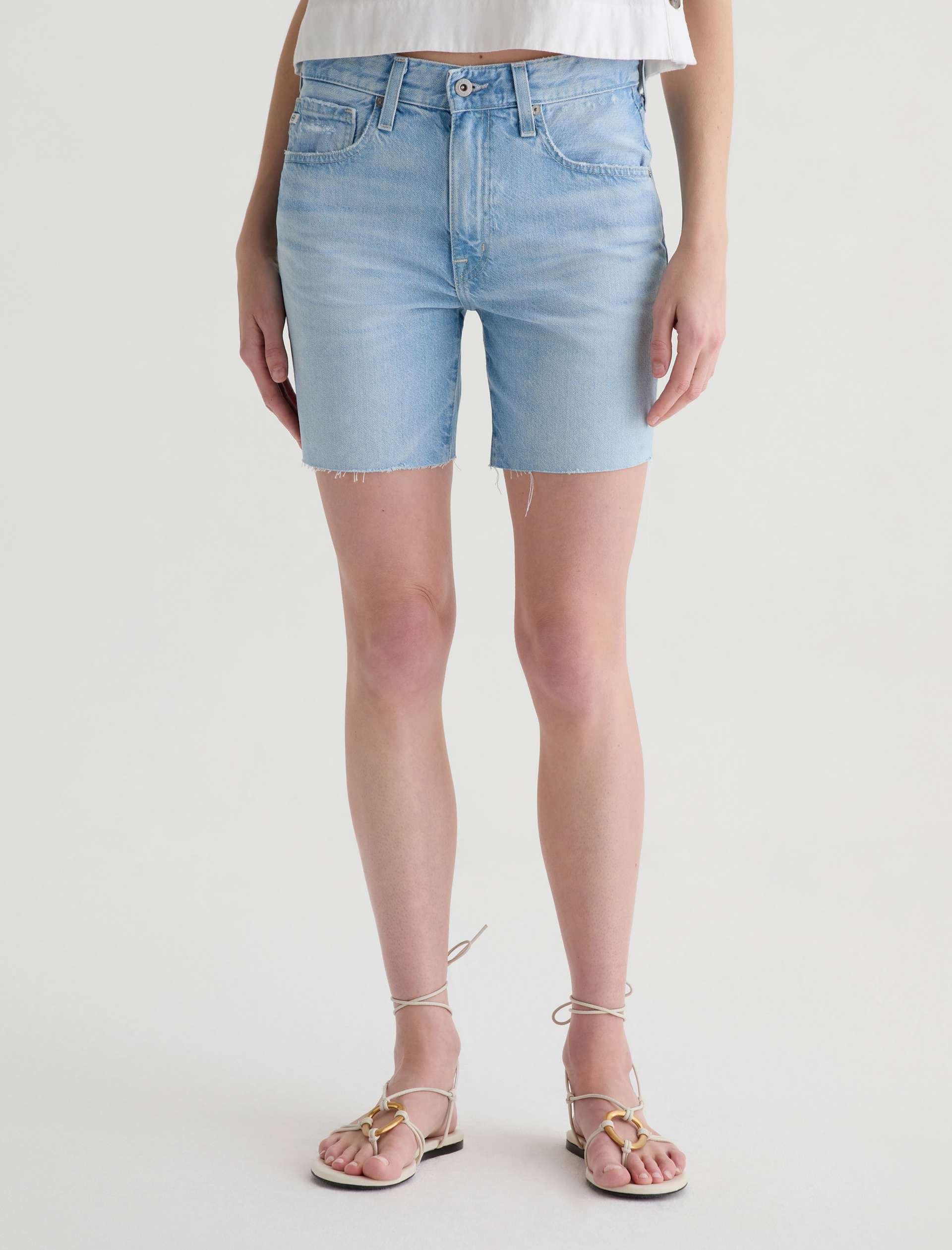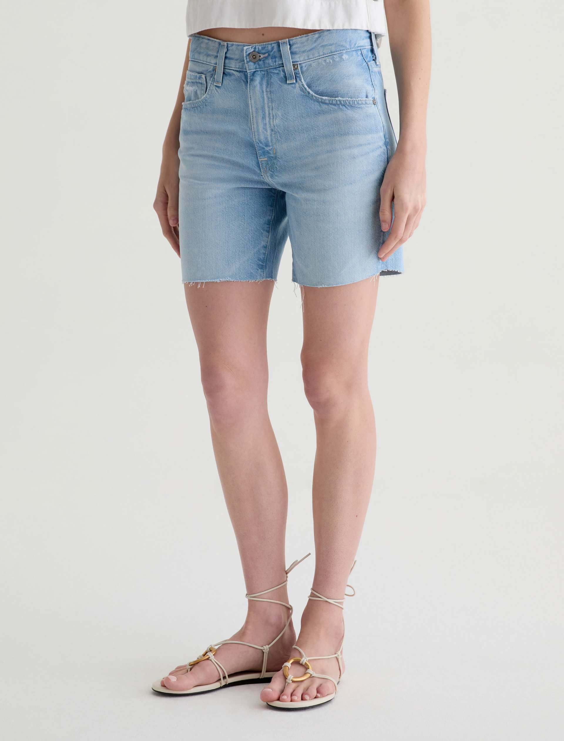 The Ex-Boyfriend Short is a mid-rise Bermuda style with a 7” inseam and raw hems. Crafted from comfort stretch denim in a light blue wash for a relaxed, worn-in feel.