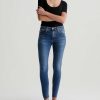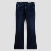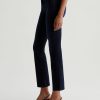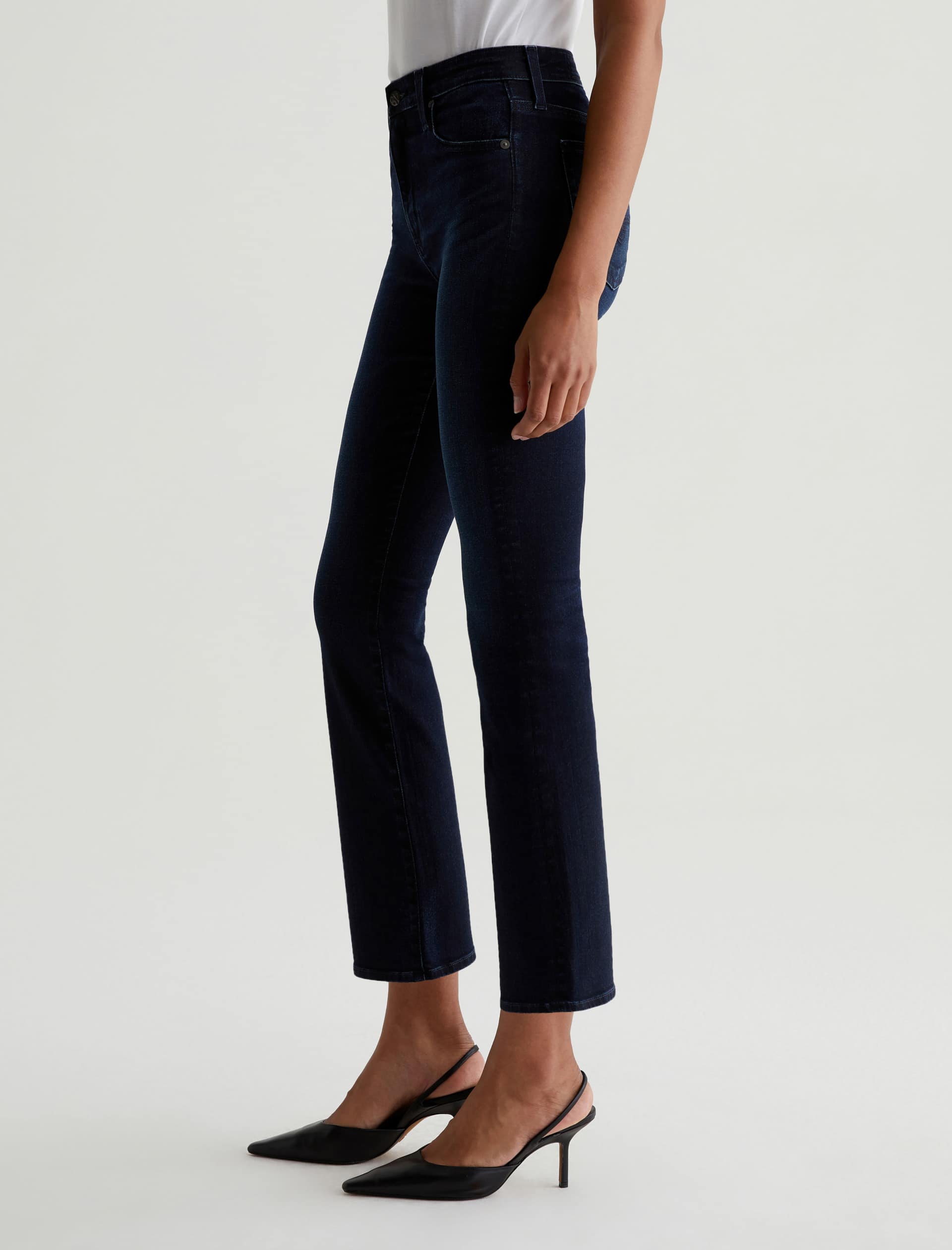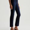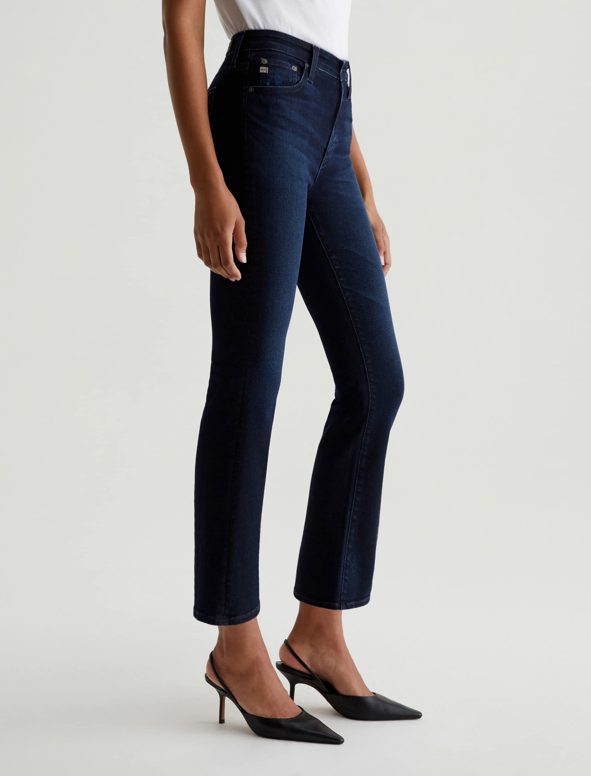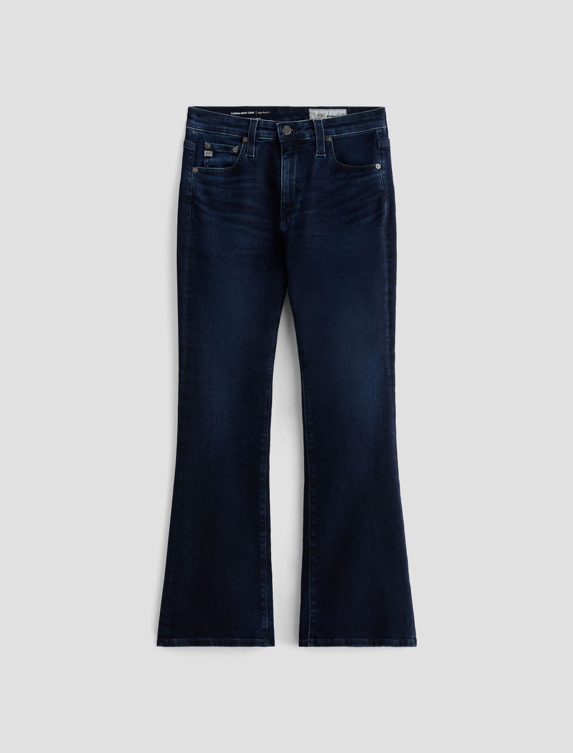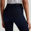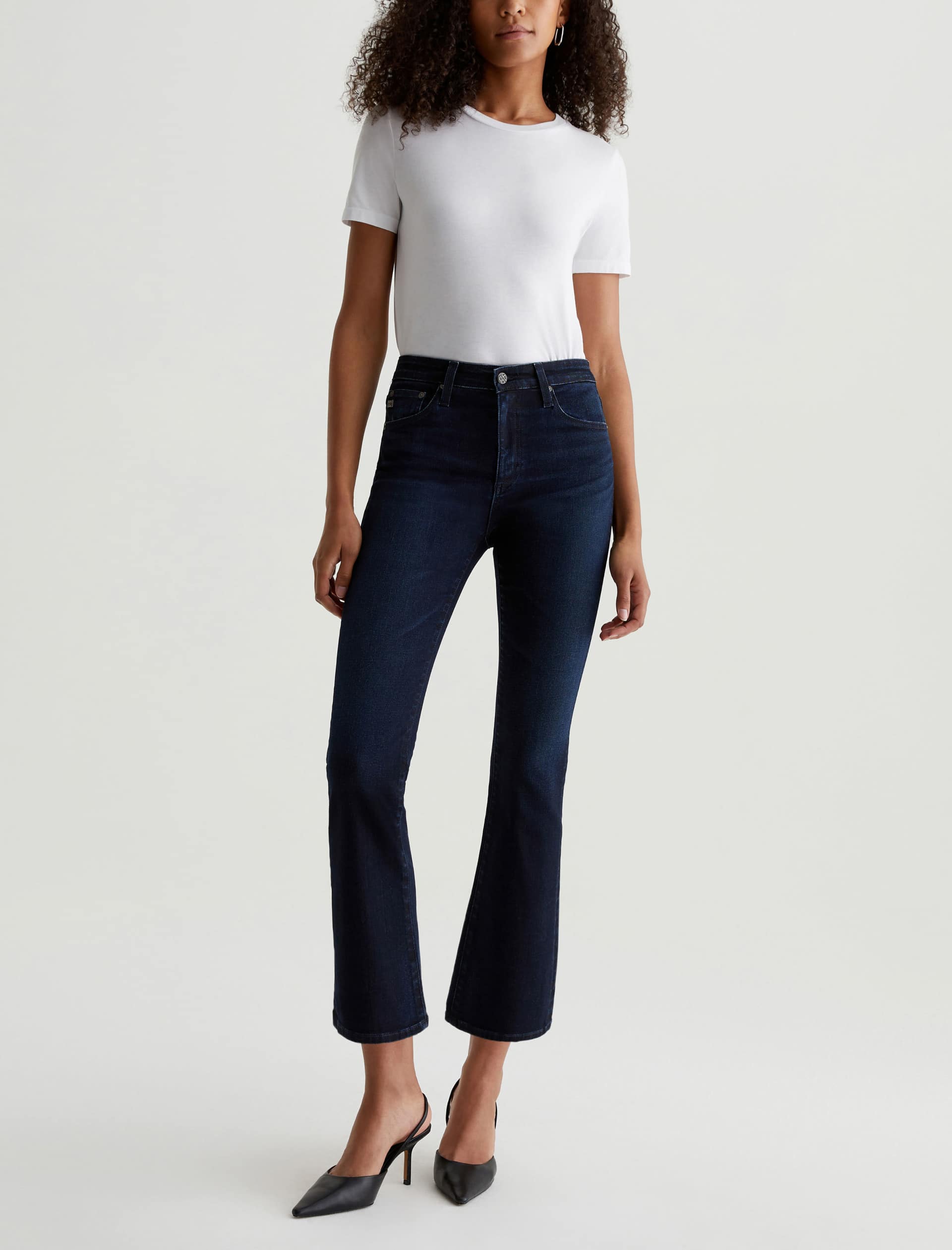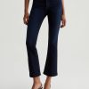 Our Farrah Boot Crop jeans feature a mid-rise bootcut silhouette in 10 oz. superstretch Empower Denim from Japan. The AG-ed™ pair features a dark blue wash worn in by subtle fading and whiskering. These women’s bootcut jeans sit right at the natural waist and has a skinny fit through the legs before opening into a subt