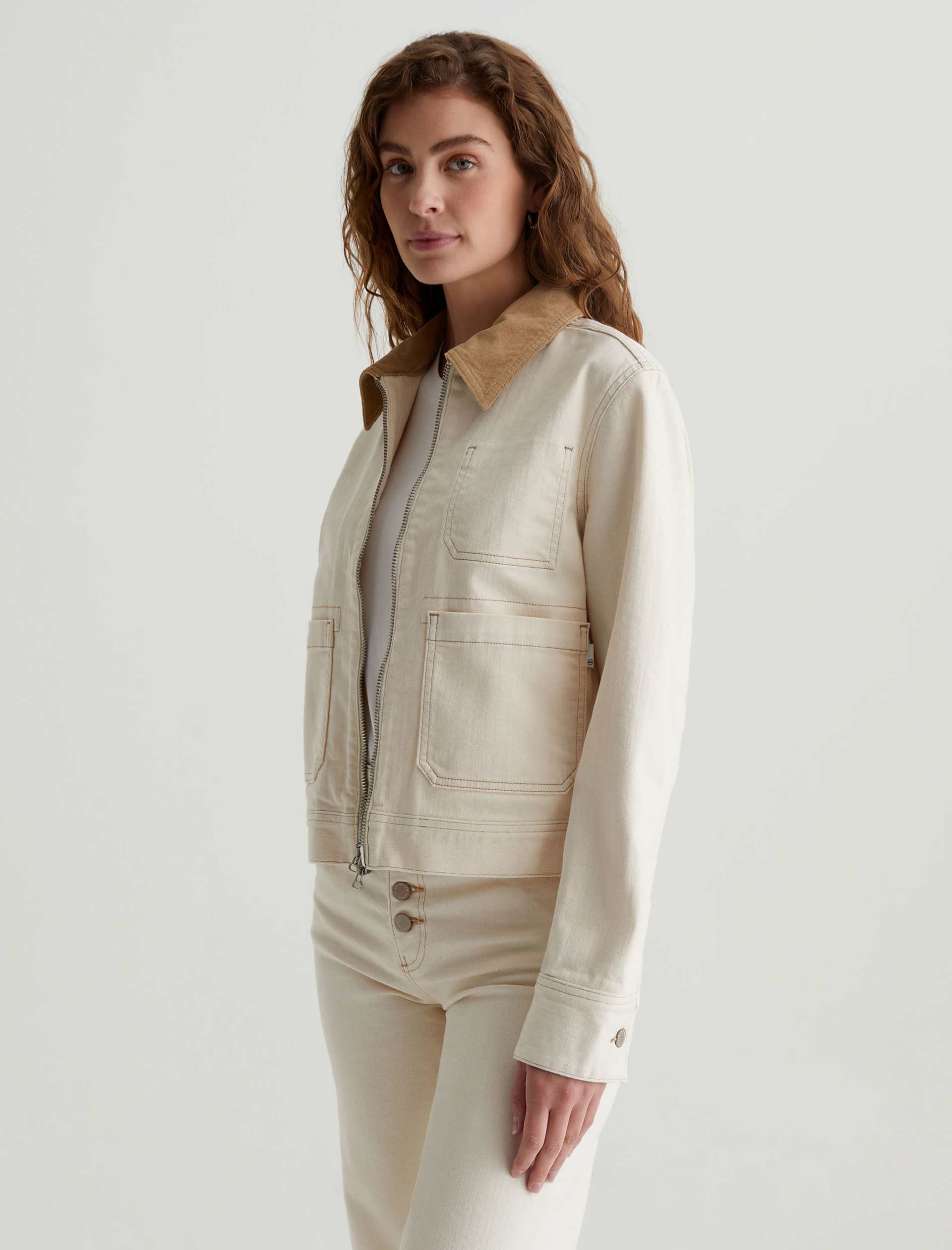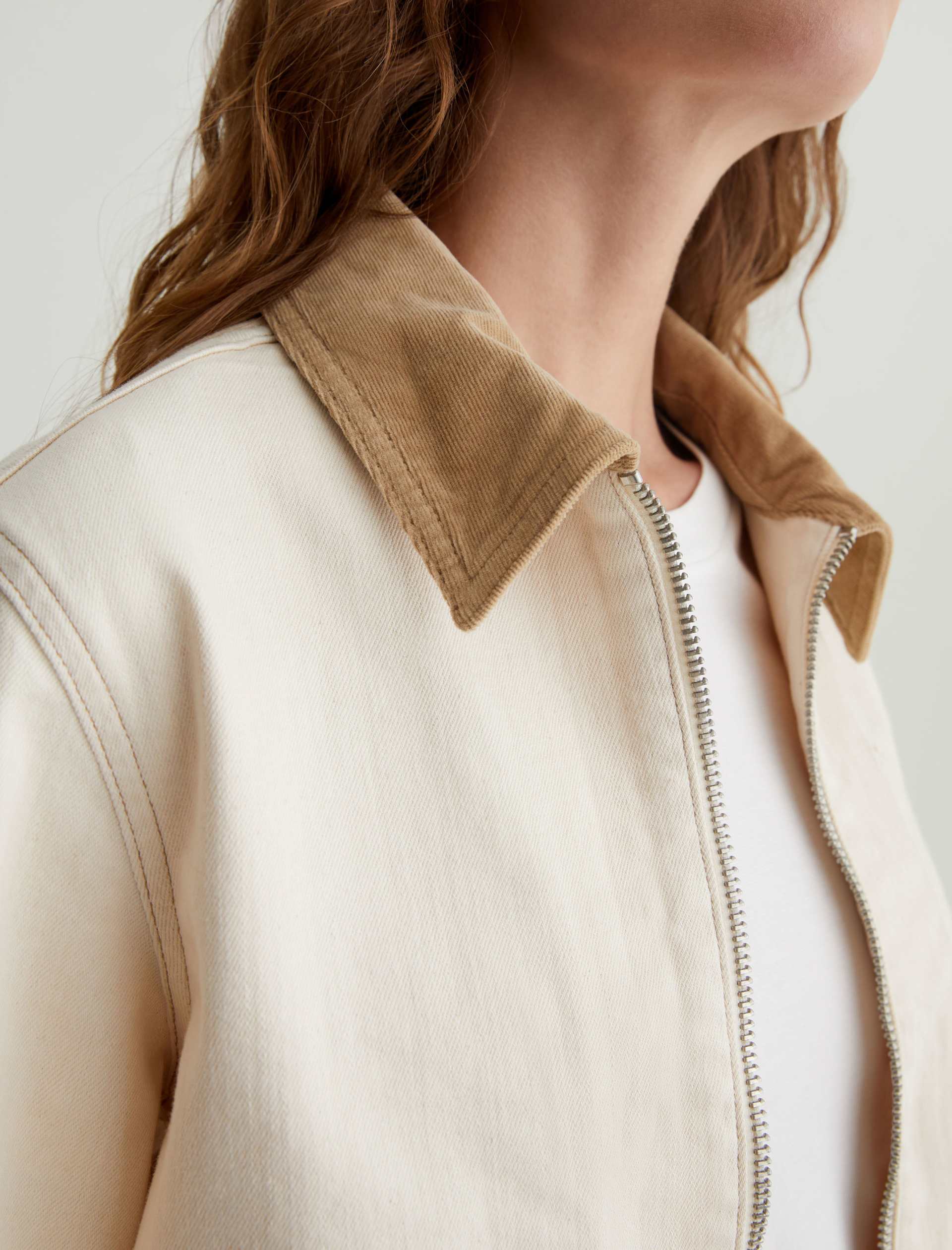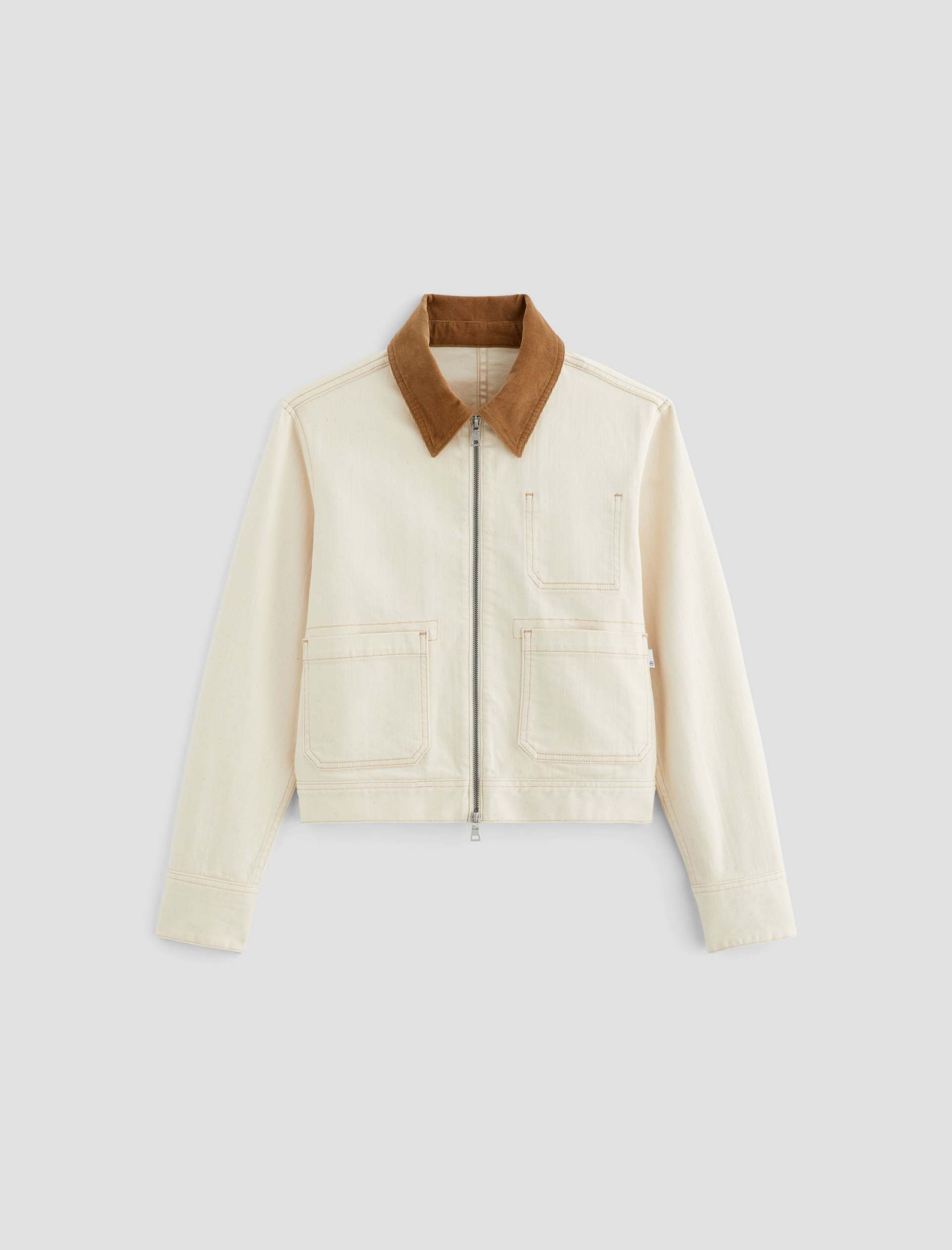A feminine take on workwear, the Jo utility jacket is designed in cream-colored Dover Stretch Denim from Japan. It’s topped by a tan corduroy collar and features a two-way zipper at the front, framed by two patch pockets. Contrast stitching accentuate the details.