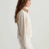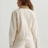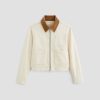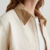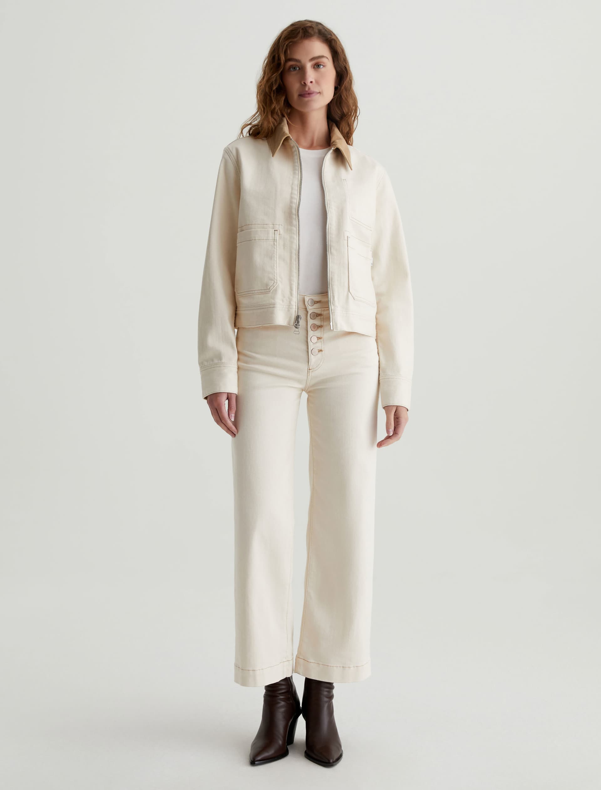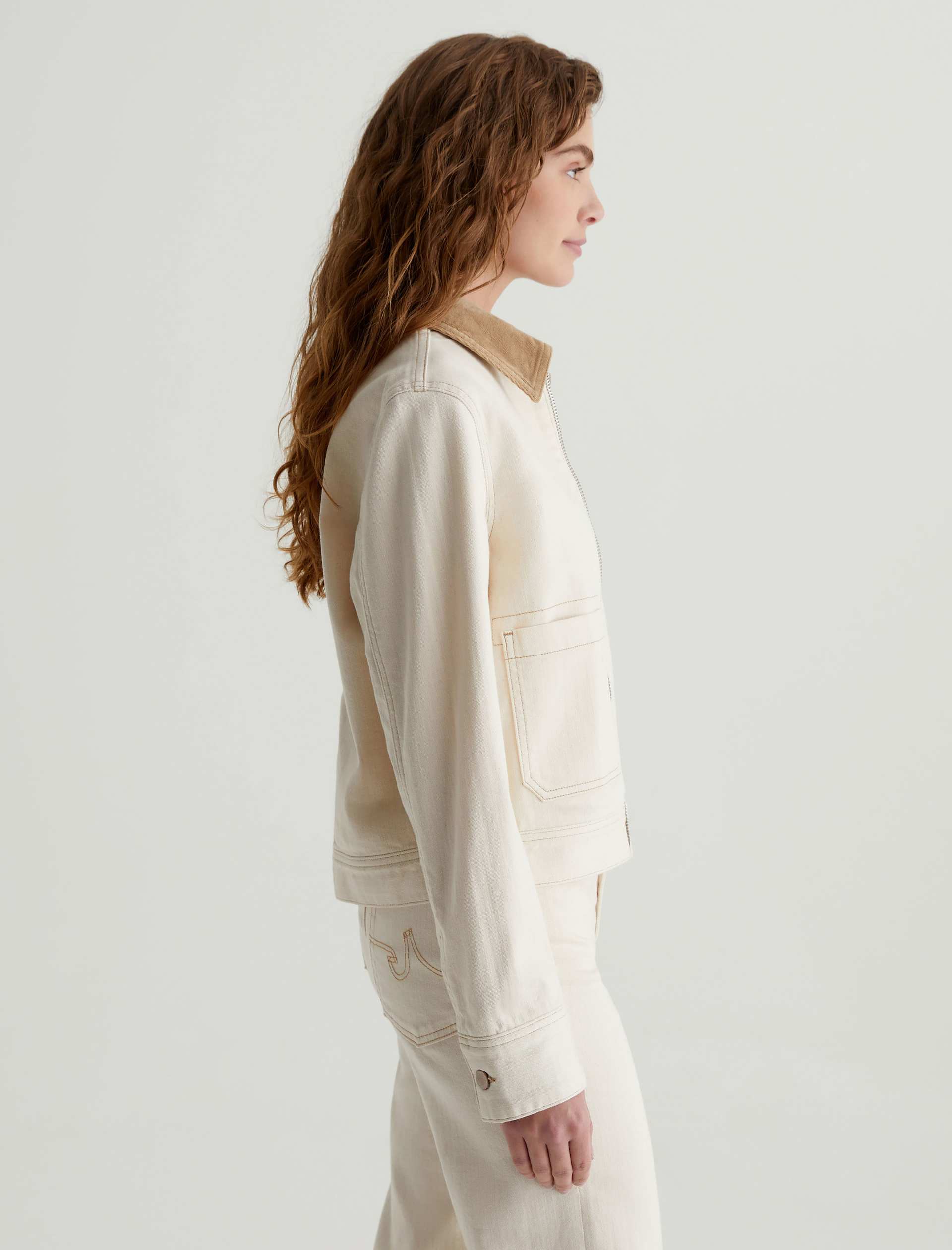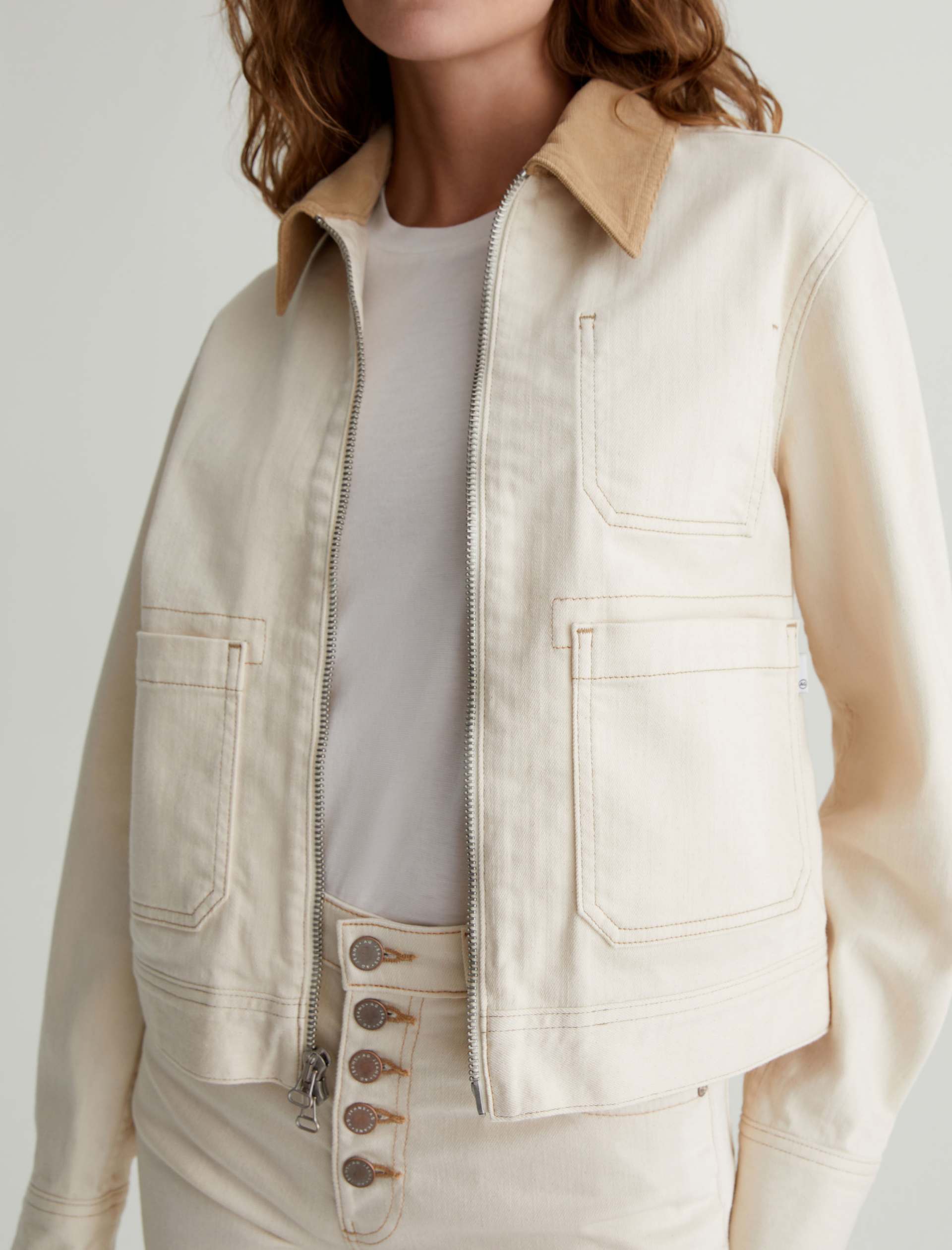 A feminine take on workwear, the Jo utility jacket is designed in cream-colored Dover Stretch Denim from Japan. It’s topped by a tan corduroy collar and features a two-way zipper at the front, framed by two patch pockets. Contrast stitching accentuate the details.