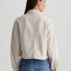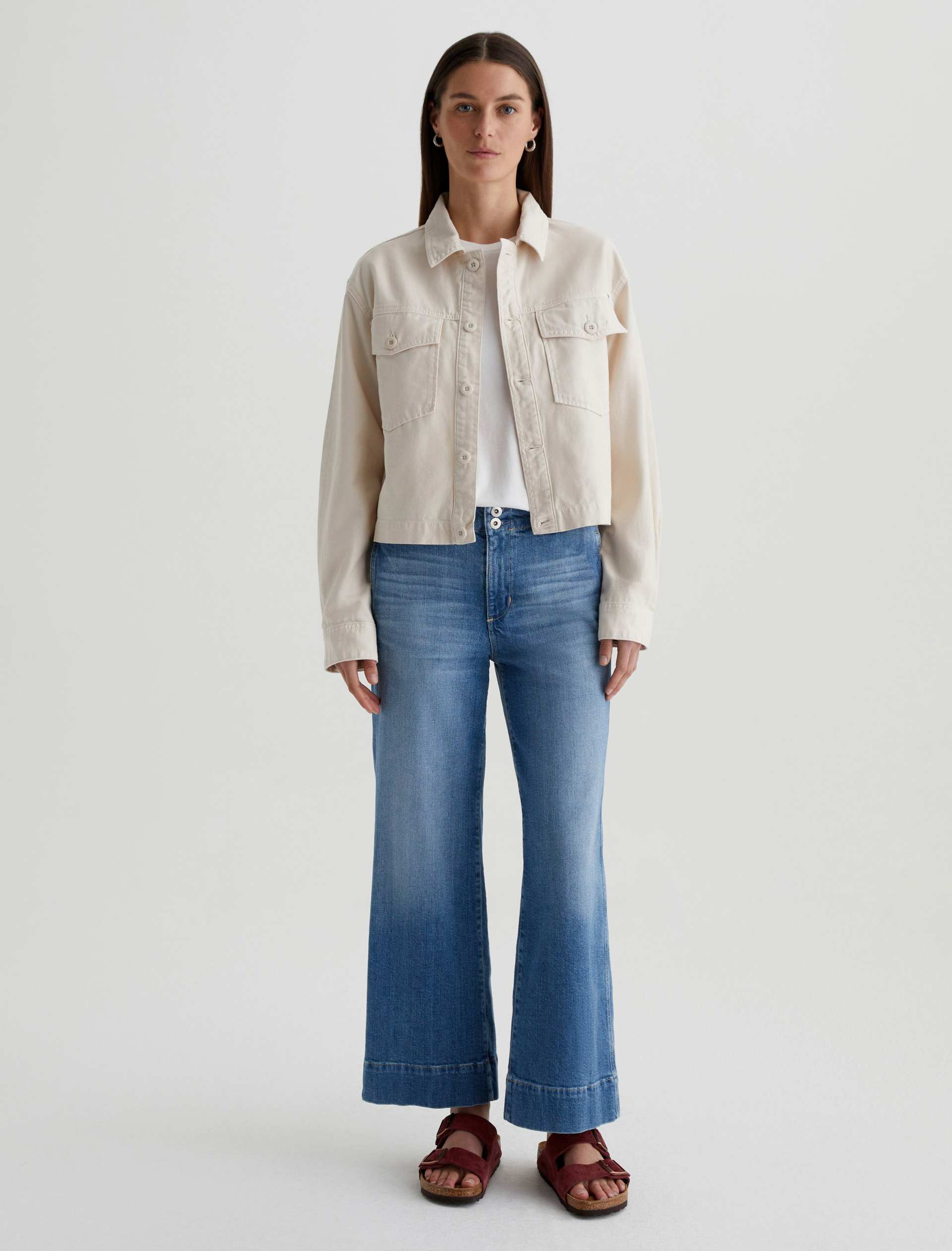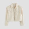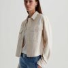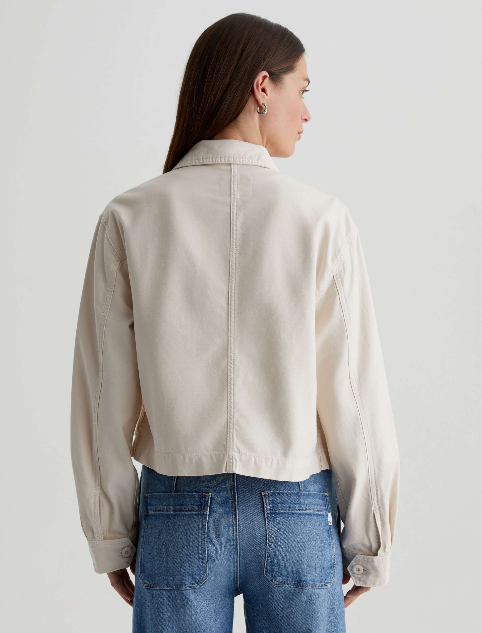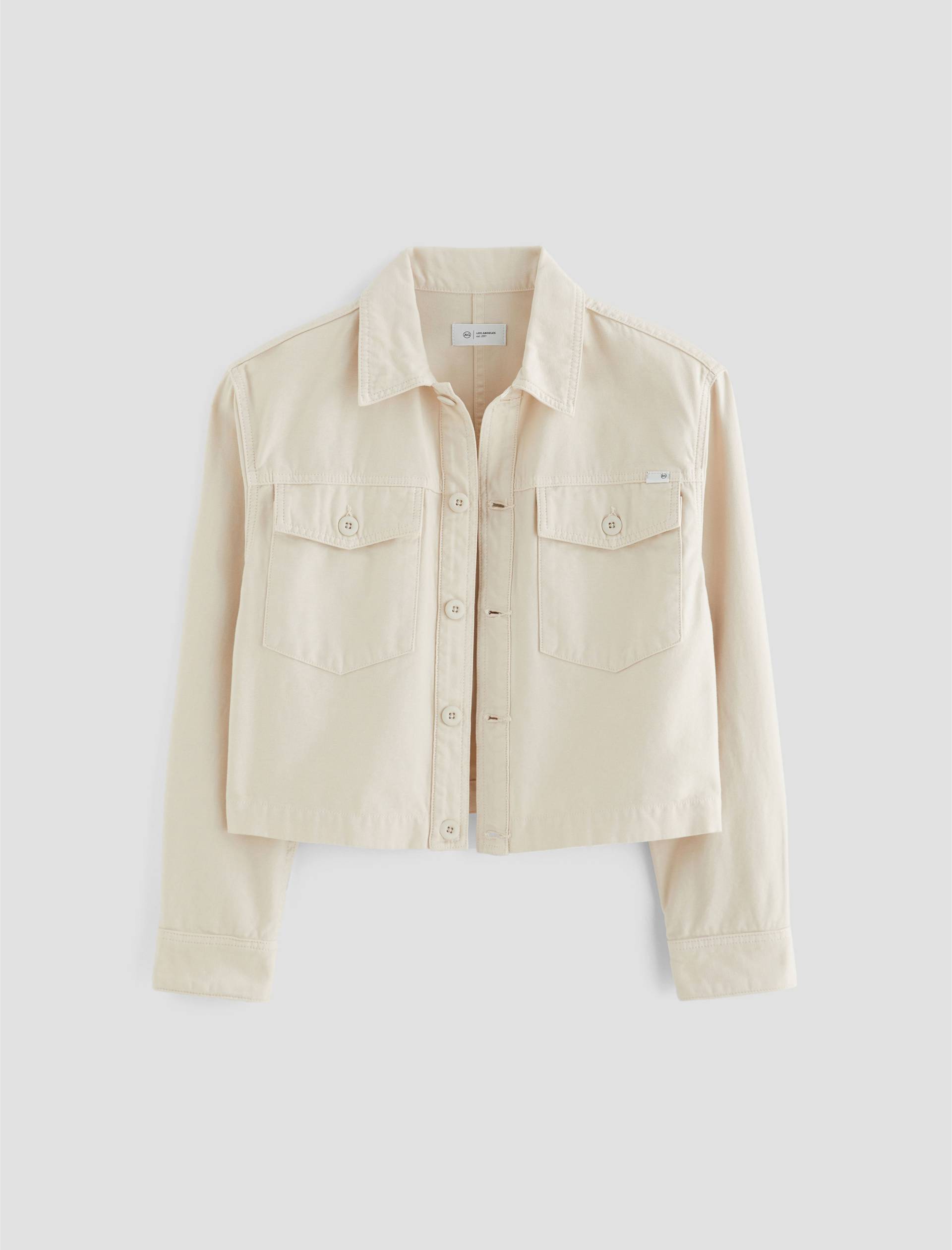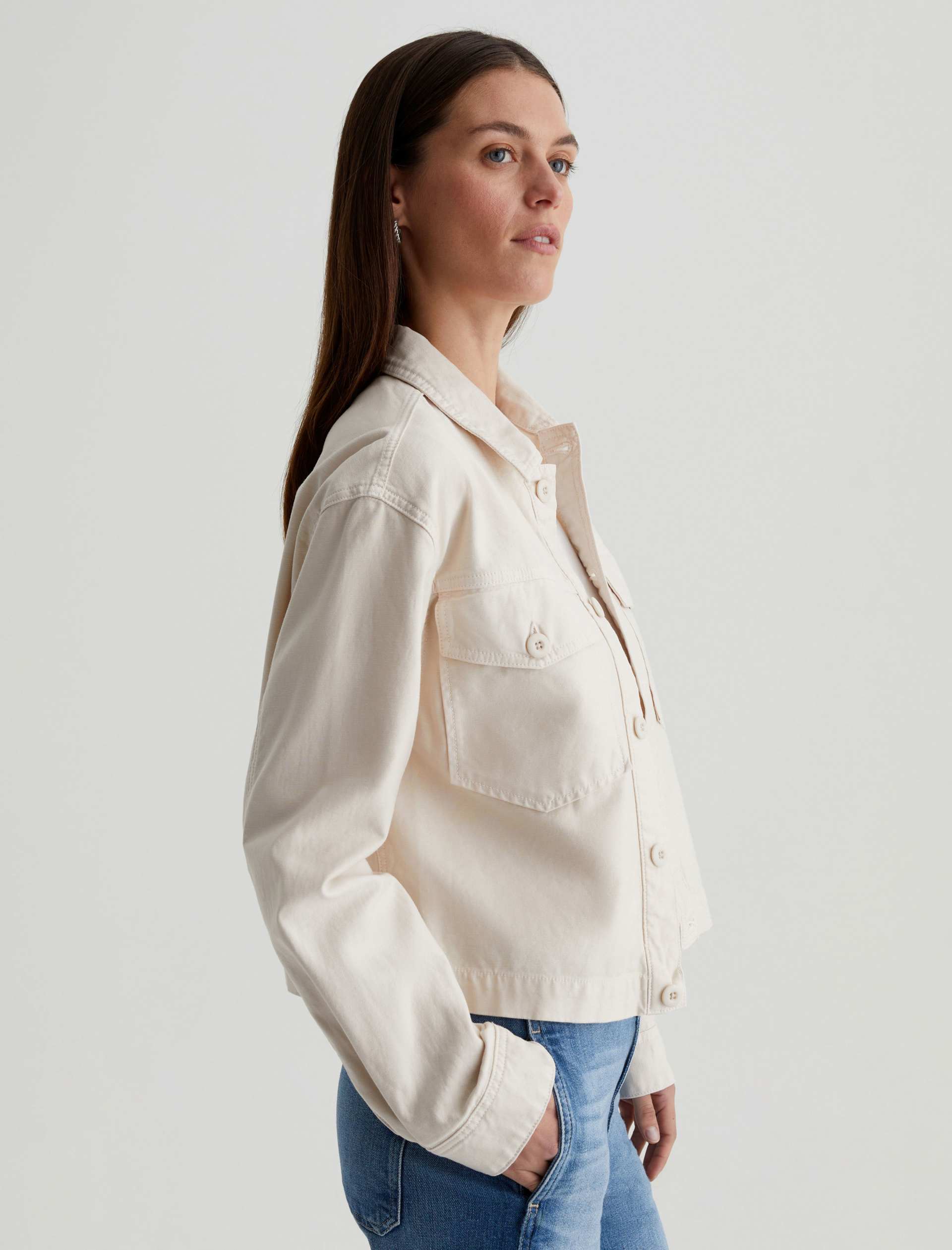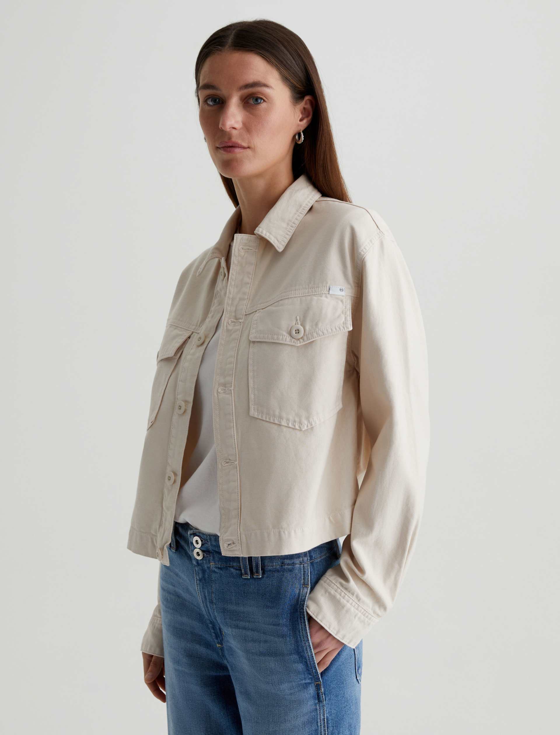 A cropped version of the classic utility shirt jacket, the Valleta layers with ease but also wears well on its own. This long-sleeve style comes in off-white Sternway Reverse Sateen and features button-through flap pockets at the front.